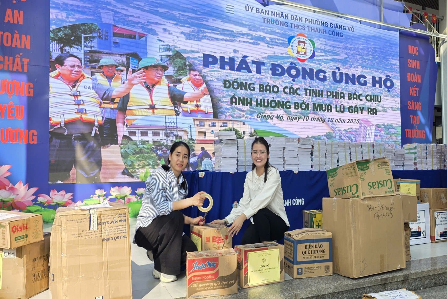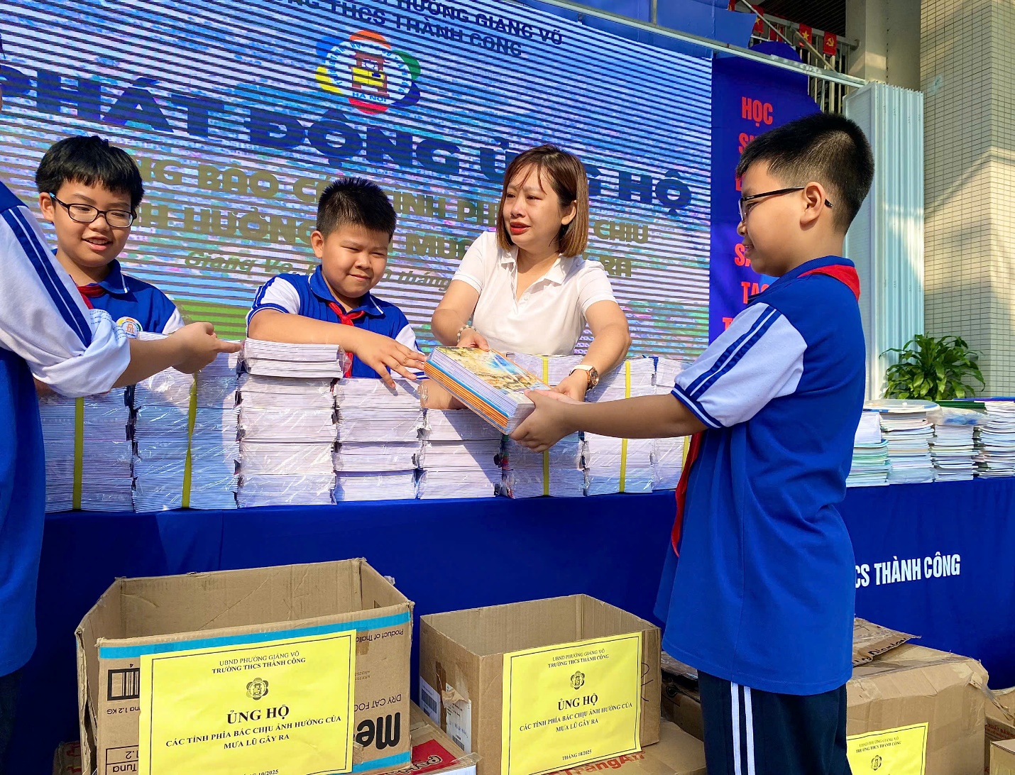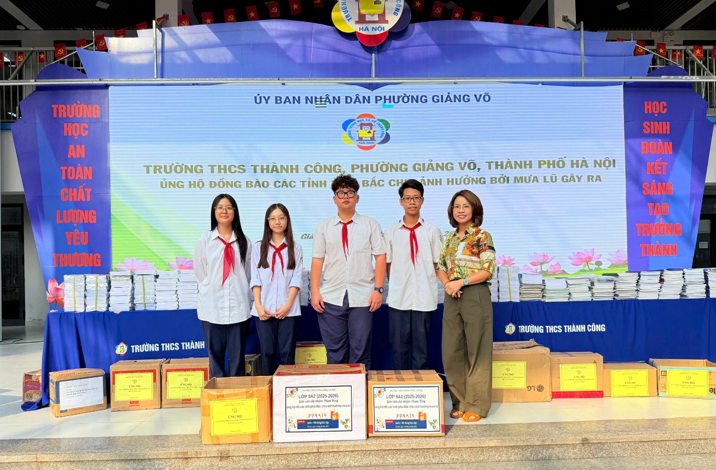Tại buổi phát động, những thùng sách vở, đồ dùng học tập… đã được trao đi trong tinh thần “Lá lành đùm lá rách” , “Một miếng khi đói bằng một gói khi no”. Mỗi món quà, dù nhỏ bé, đều chứa đựng tấm lòng sẻ chia, yêu thương và trách nhiệm xã hội của thầy trò trường THCS Thành Công gửi đến đồng bào vùng bão lũ.