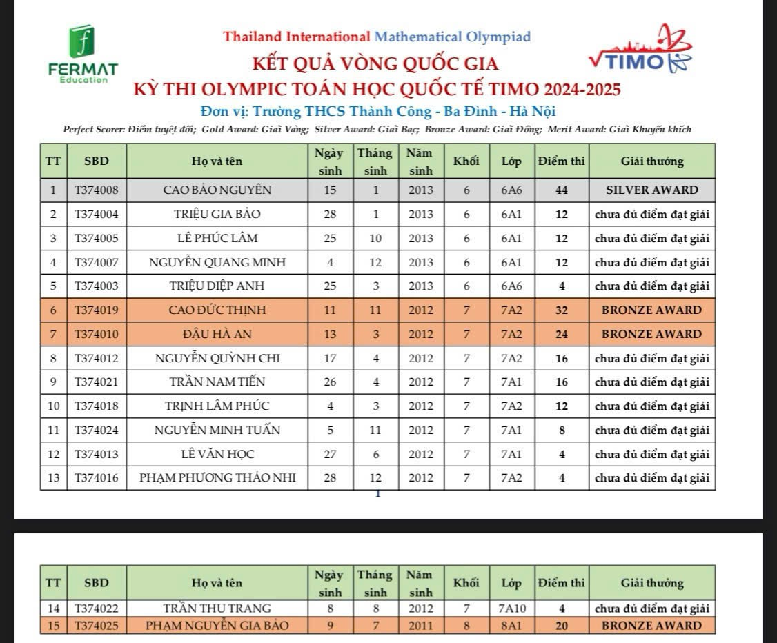 Tại Vòng quốc gia Kỳ thi Olympic Toán học quốc tế Timo 2024-2025, dưới sự hướng dẫn, lãnh đội của cô giáo Bùi Lan Anh (GV Tổ Tự nhiên 1), 05 học sinh trường THCS Thành Công đã đạt được thành tích: