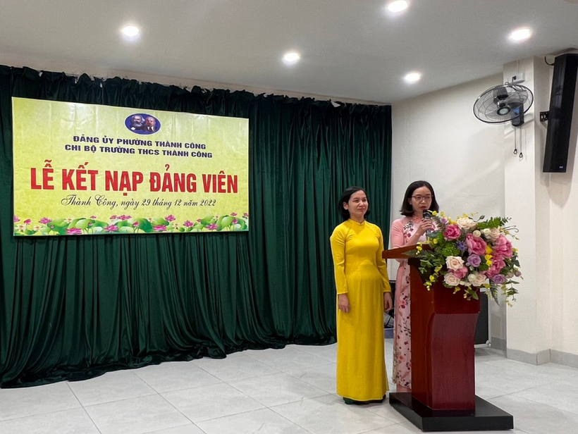 Thực hiện chương trình công tác Đảng năm 2022, được sự nhất trí của Đảng ủy phường Thành Công, chiều ngày 29/12/2022, Chi bộ trường THCS Thành Công đã tổ chức buổi Lễ kết nạp Đảng viên mới cho hai đồng chí quần chúng ưu tú là Phạm Thị Huế và Nguyễn Thị Hằng. Đây là sự kiên có ý nghĩa quan trọng trong công tác phát triển Đảng viên và thực hiện công tác xây dựng tổ chức Đảng. Tại buổi lễ, đồng chí Nguyễn Ngọc Anh - Bí thư Chi bộ trường THCS Thành Công đã công bố quyết định, trao quyết định kết nạp đảng viên mới cho hai đồng chí. Bên cạnh gửi lời chúc mừng, đồng chí Ngọc Anh cũng nhấn mạnh nhiệm vụ, quyền hạn của người đảng viên mới, phân công đảng viên trong chi bộ tiếp tục giúp đỡ để hai đồng chí đảng viên dự bị phấn đấu trở thành đảng viên chính thức.