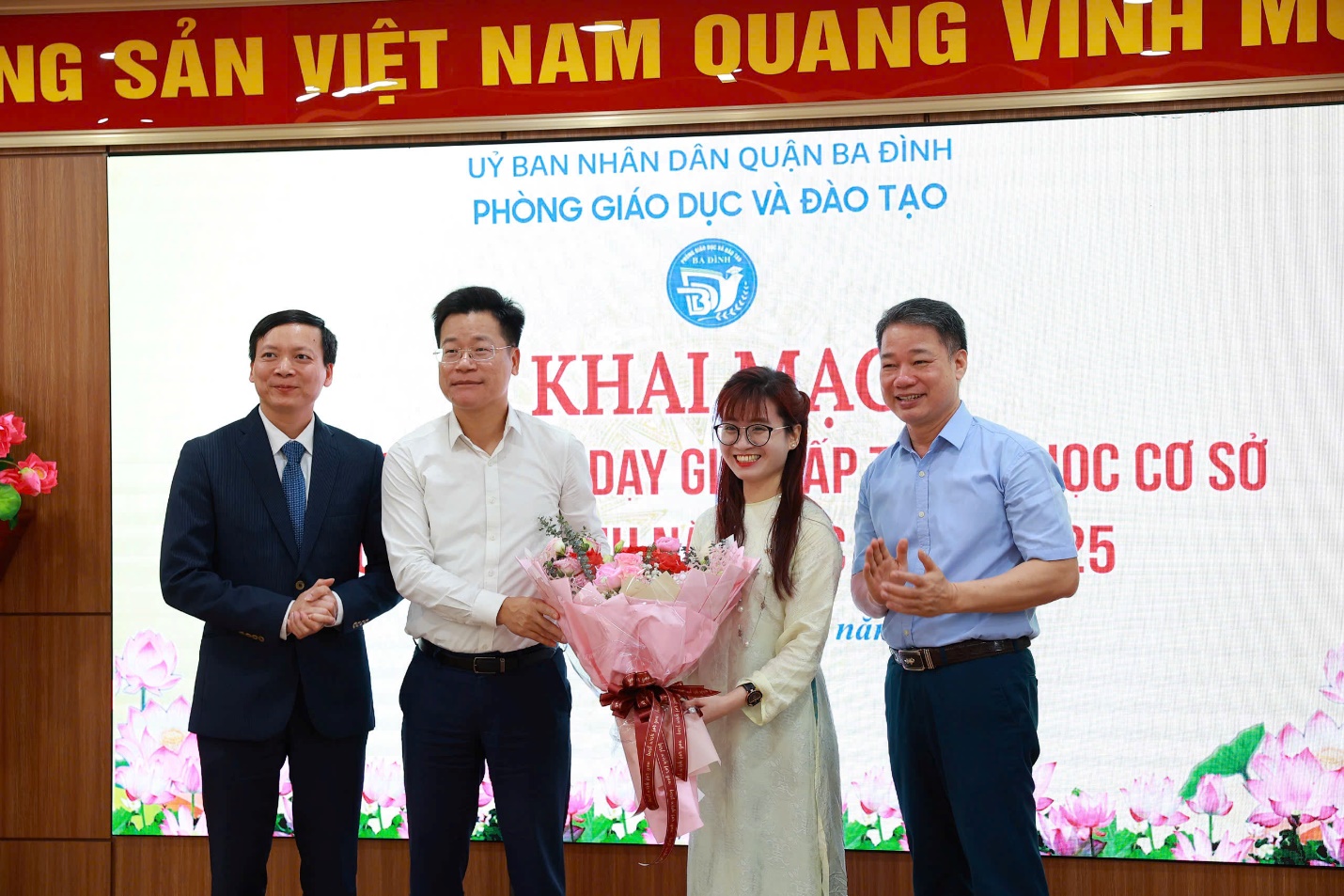 Các đ/c lãnh đạo Sở GD&ĐT thành phố Hà Nội, phòng GD&ĐT quận Ba Đình tặng hoa cô Khánh Linh - đại diện giáo viên tham dự hội thi