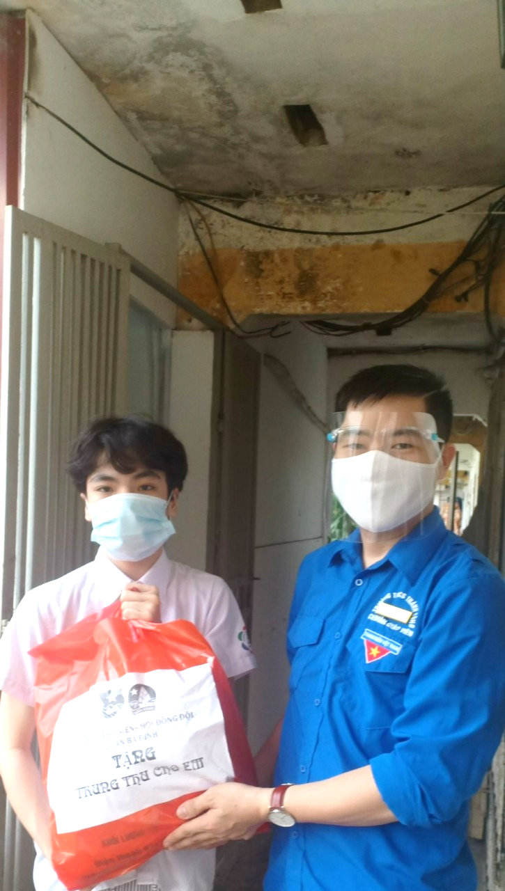 Thầy Phạm Thanh Tùng - Bí thư chi đoàn giáo viên của nhà trường trao quà Trung thu của Đoàn Thanh niên - Hội đồng Đội quận Ba Đình tại gia đình học sinh Phạm Gia Khiêm