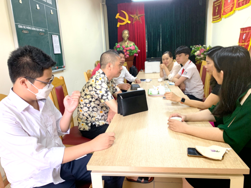 Ban giám hiệu, các bác phụ huynh, các cô giáo và em Phạm Gia Khiêm cùng trò chuyện, chia sẻ.