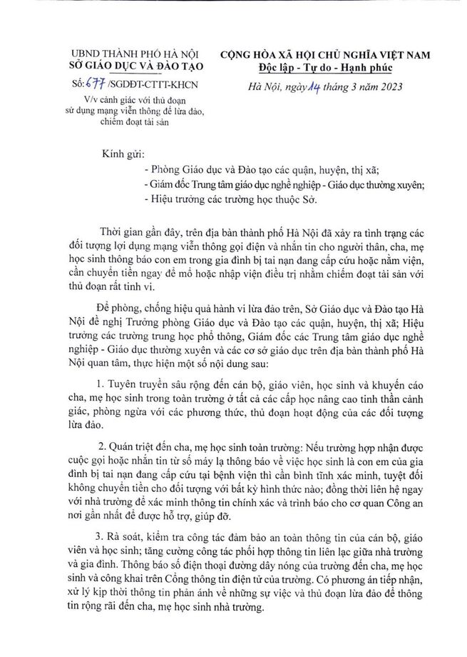 Thời gian gần đây, trên địa bàn thành phố Hà Nội có hiện tượng một số kẻ xấu thường giả danh GVCN, nhân viên y tế, giám thị.... của các nhà trường gọi điện báo tin con gặp nạn, qua đó tiền hành lừa đảo bằng cách yêu cầu chuyển tiền để làm phẫu thuật gấp. Kẻ xấu nắm rất rõ thông tin của học sinh và tên chính xác của giáo viên, kể cả môn dạy.