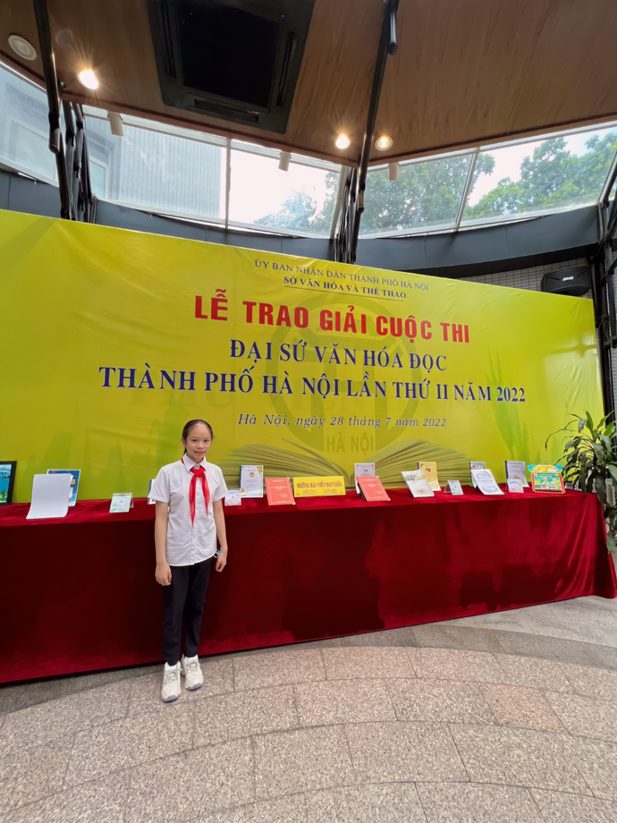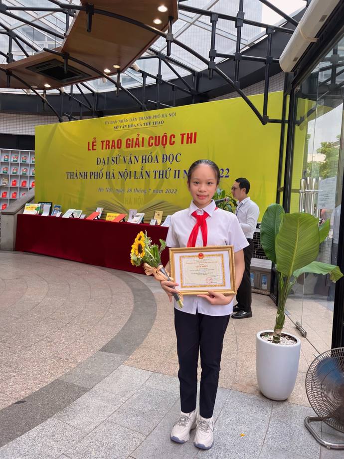 Ngày 26/7/2022, Sở Văn hóa, Thể thao và Du lịch (VH,TT&DL) tổ chức tổng kết và trao giải cuộc thi “Đại sứ văn hóa đọc” năm 2022. Thí sinh Nguyễn Linh Nhi – học sinh lớp 7A6 trường THCS Thành Công đạt giải Ba cuộc thi này.