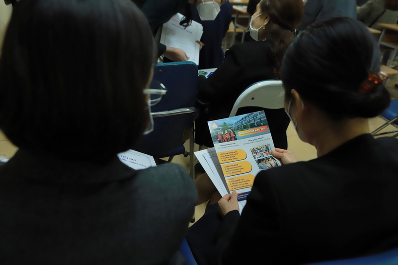 Phụ huynh học sinh chăm chú lắng nghe và tìm hiểu về các trường nghề.