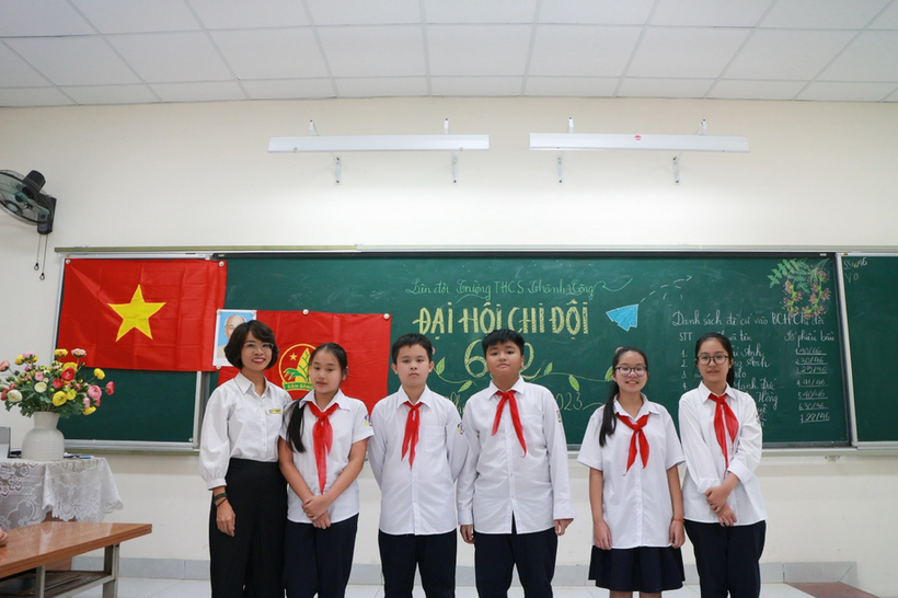 Ban chỉ huy chi Đội lớp 6A2 và cô giáo chủ nhiệm Phạm Thị Hồng.