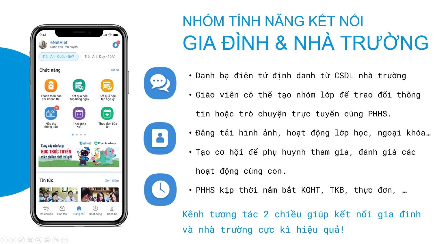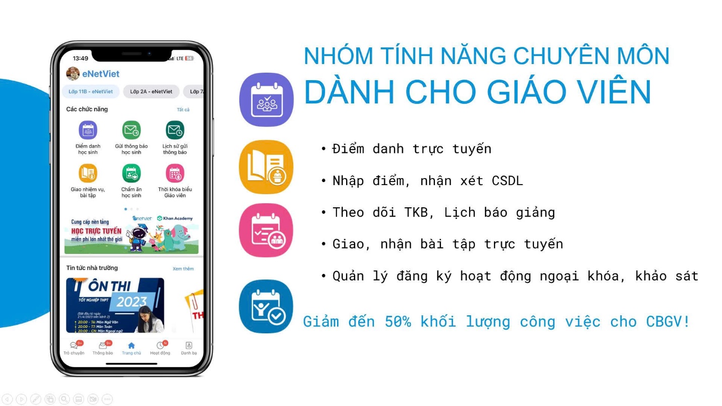 eNetViet không chỉ là kênh liên lạc trực tuyến giữa giáo viên với phụ huynh học sinh mà còn tích hợp các chức năng đa dạng giúp các giáo viên tiết kiệm nhiều thời gian, công sức so với việc phải cùng lúc sử dụng nhiều phần mềm như trước đây.