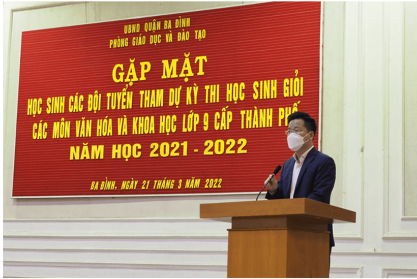 Ông Lê Đức Thuận – Quận ủy viên, Trưởng phòng GD&ĐT - phát biểu tại buổi gặp mặt học sinh các đội tuyển tham dự Kỳ thi học sinh giỏi các môn văn hóa và khoa học cấp Thành phố năm học 2021-2022