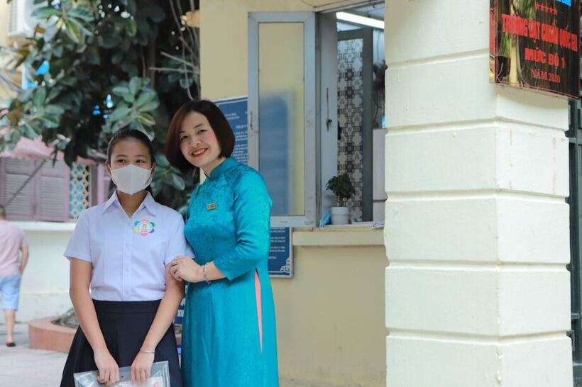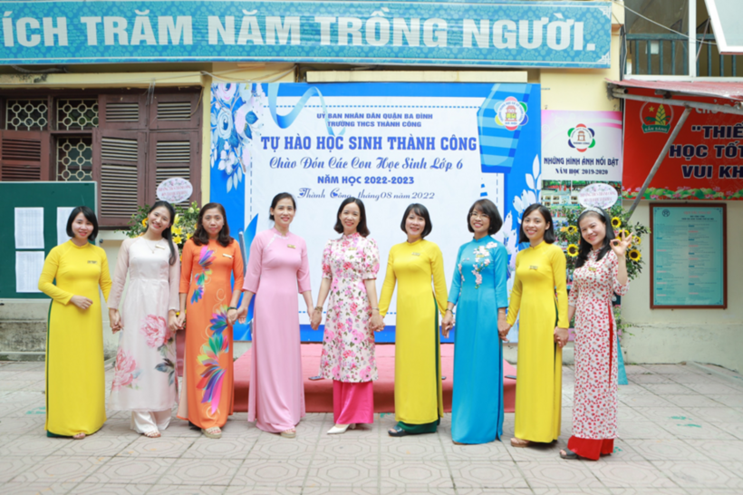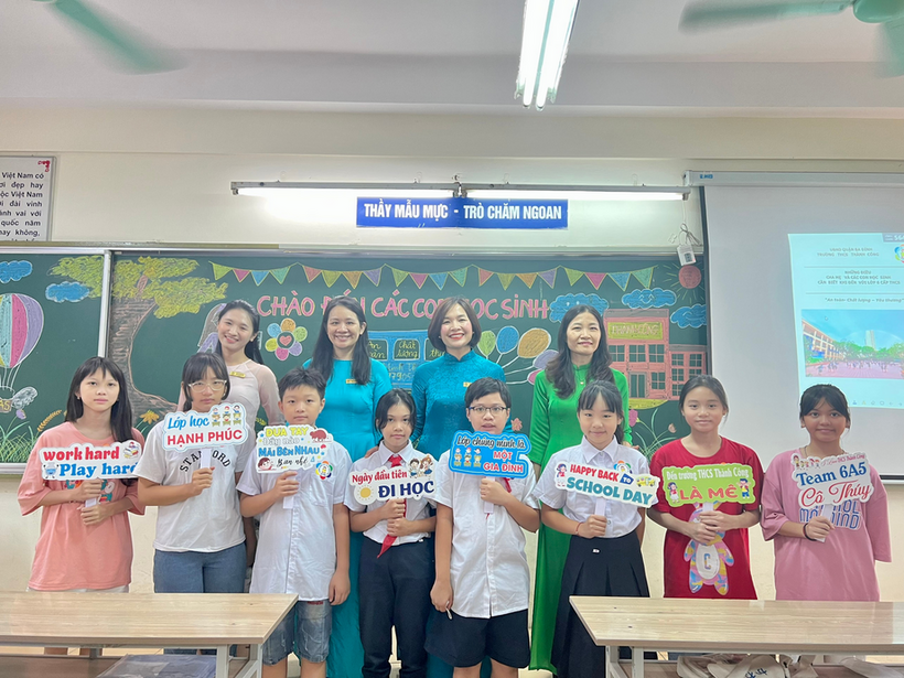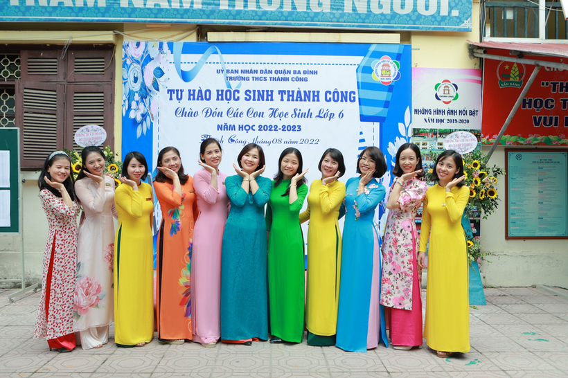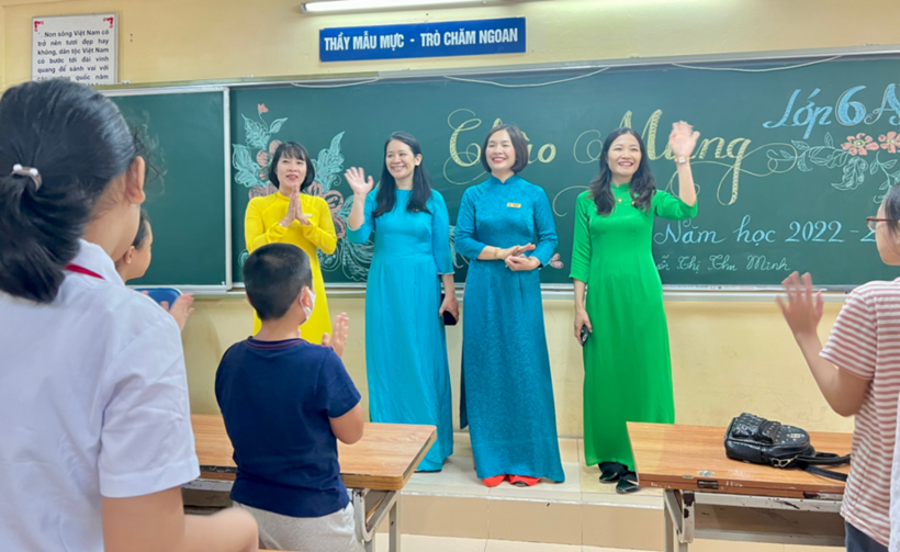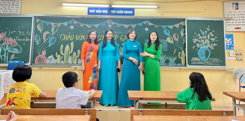 Ban giám hiệu nhà trường cùng các cô giáo chủ nhiệm khối 6 rạng rỡ trong ngày đón các con