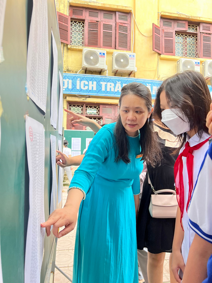 Cô giáo Ngô Thị Phượng và cô giáo Trần Thị Quỳnh Hương, Phó hiệu trưởng nhà trường nhiệt tình chỉ dẫn cho các con