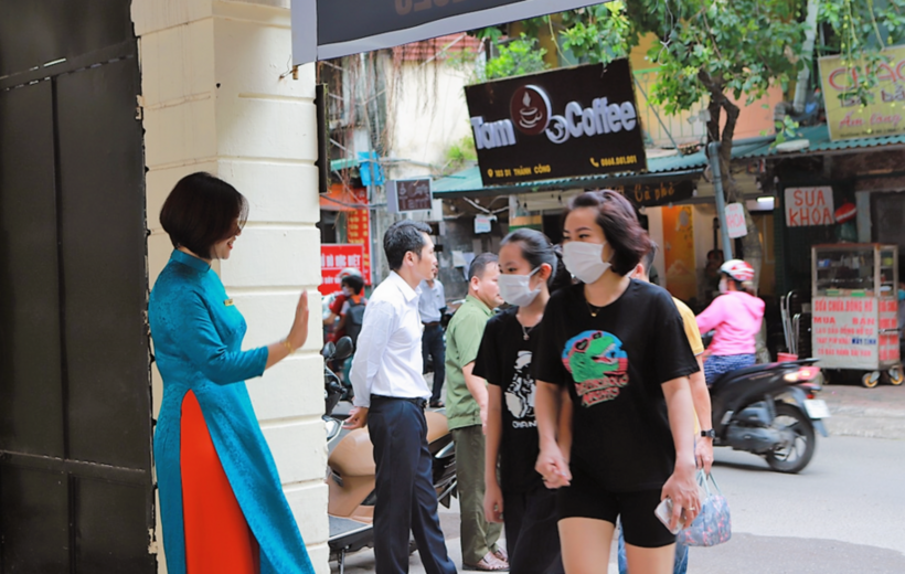 Cô giáo Nguyễn Ngọc Anh, Hiệu trưởng nhà trưởng ân cần đón các con tại cổng trường