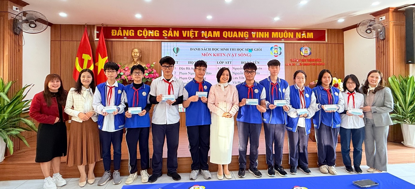 Ban giám hiệu nhà trường, cô giáo lãnh đội cùng Đội tuyển học sinh giỏi môn KHTN (Vật sống)