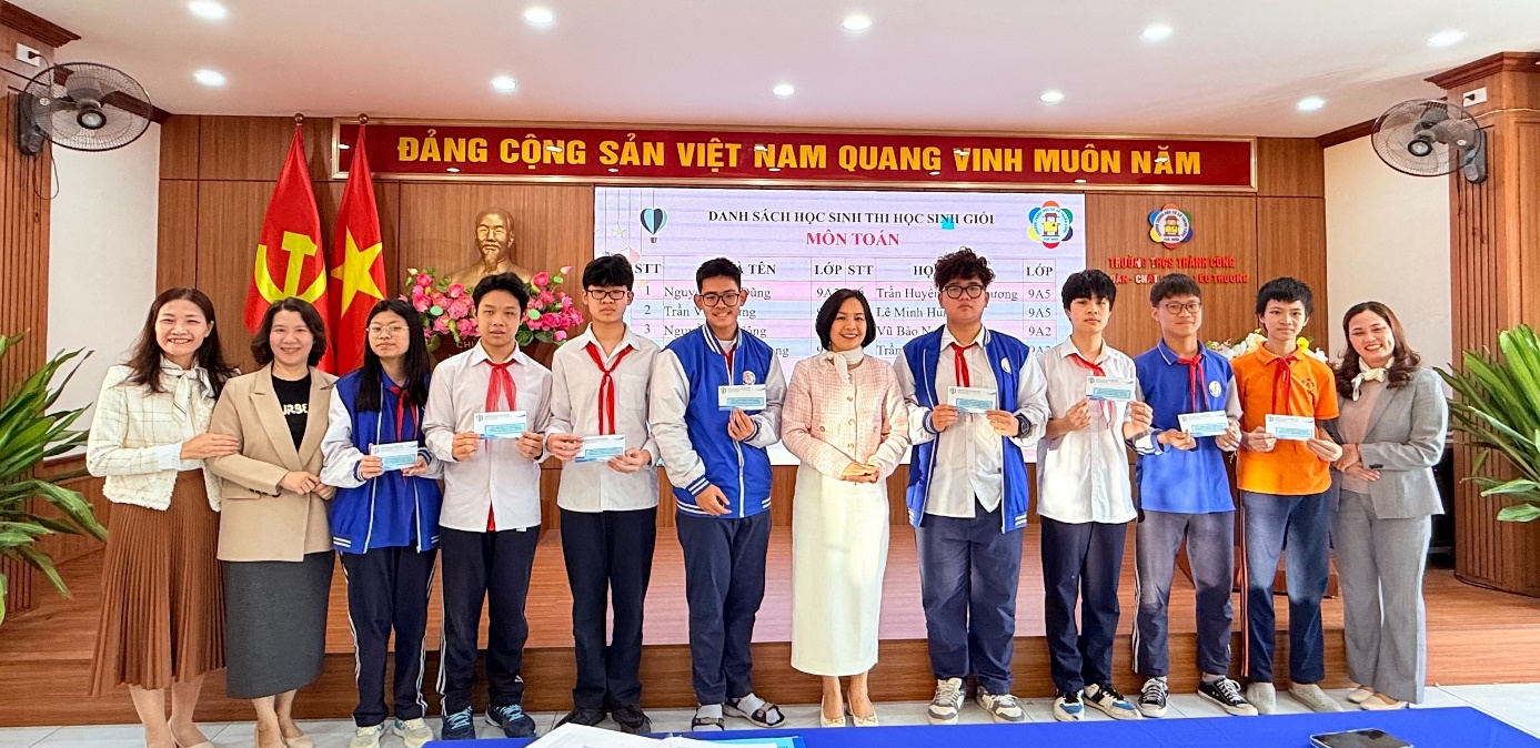 Ban giám hiệu nhà trường, cô giáo lãnh đội cùng Đội tuyển học sinh giỏi môn Toán