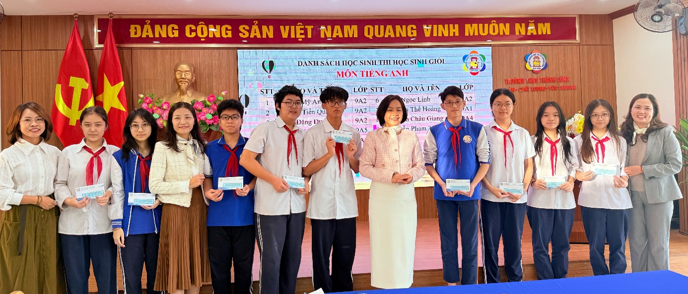 Ban giám hiệu nhà trường, cô giáo lãnh đội cùng Đội tuyển học sinh giỏi môn Tiếng Anh
