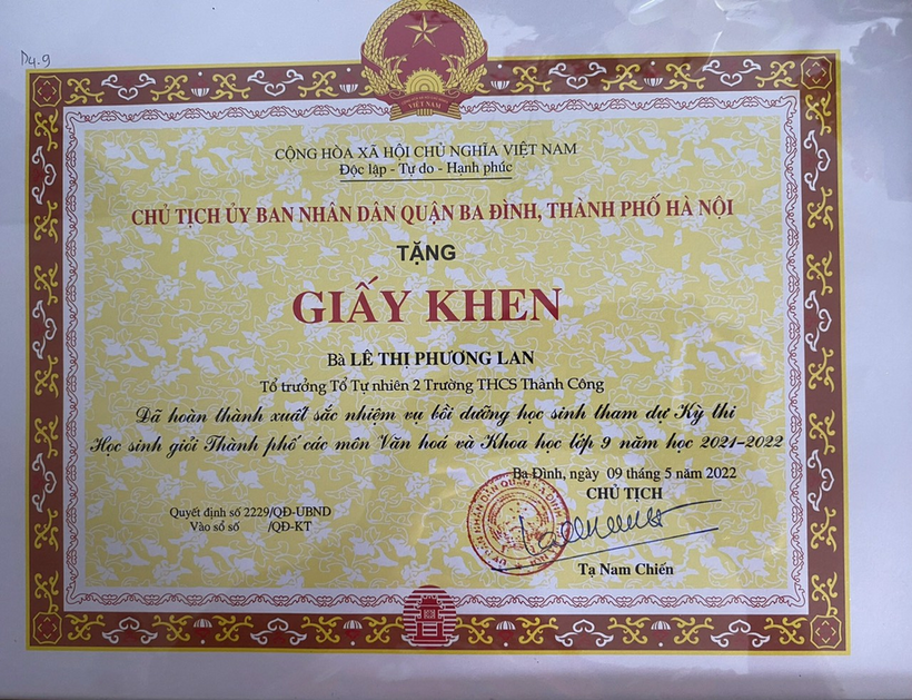 Cô Lê Thị Phương Lan nhận giấy khen hoàn thành xuất sắc nhiệm vụ bồi dưỡng học sinh của quận tham dự Kì thi Học sinh giỏi Thành phố