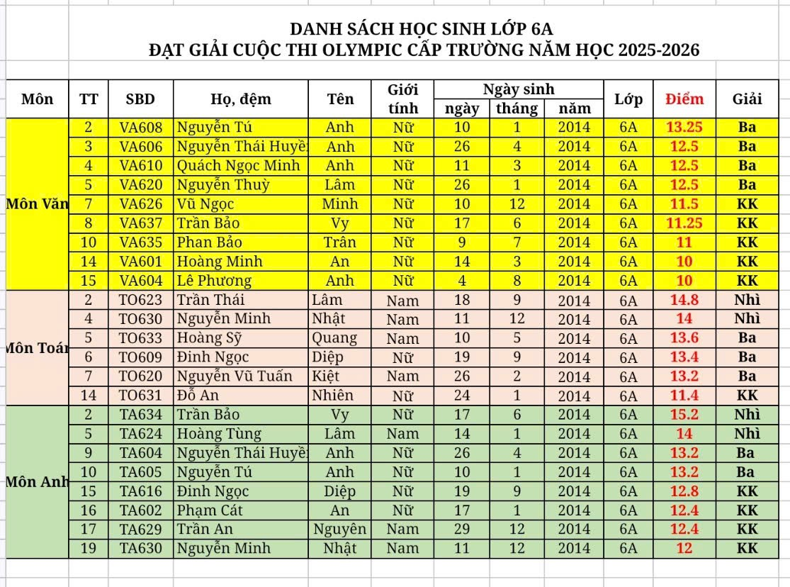 Niềm vui từ cuộc thi lại góp thêm một kỷ niệm đẹp cho 6A trong năm học này. Hy vọng rằng từ những thành công bước đầu ấy, các bạn sẽ tiếp tục giữ vững tinh thần ham học hỏi, đoàn kết và cùng nhau chinh phục thêm nhiều thành tích mới trong thời gian tới!