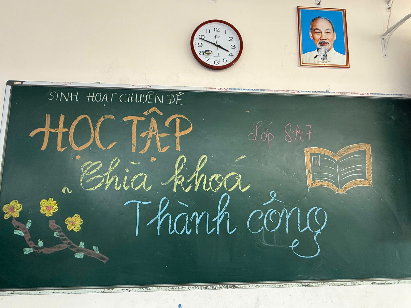 Ngay từ những phút đầu, bảng lớp được trang trí đầy sáng tạo với dòng chữ nổi bật “Học tập – Chìa khóa thành công”cùng hình ảnh trang sách, cành mai rực rỡ. Không gian ấy đã truyền đi thông điệp mạnh mẽ rằng học tập chính là con đường mở ra tương lai tươi sáng cho mỗi người.