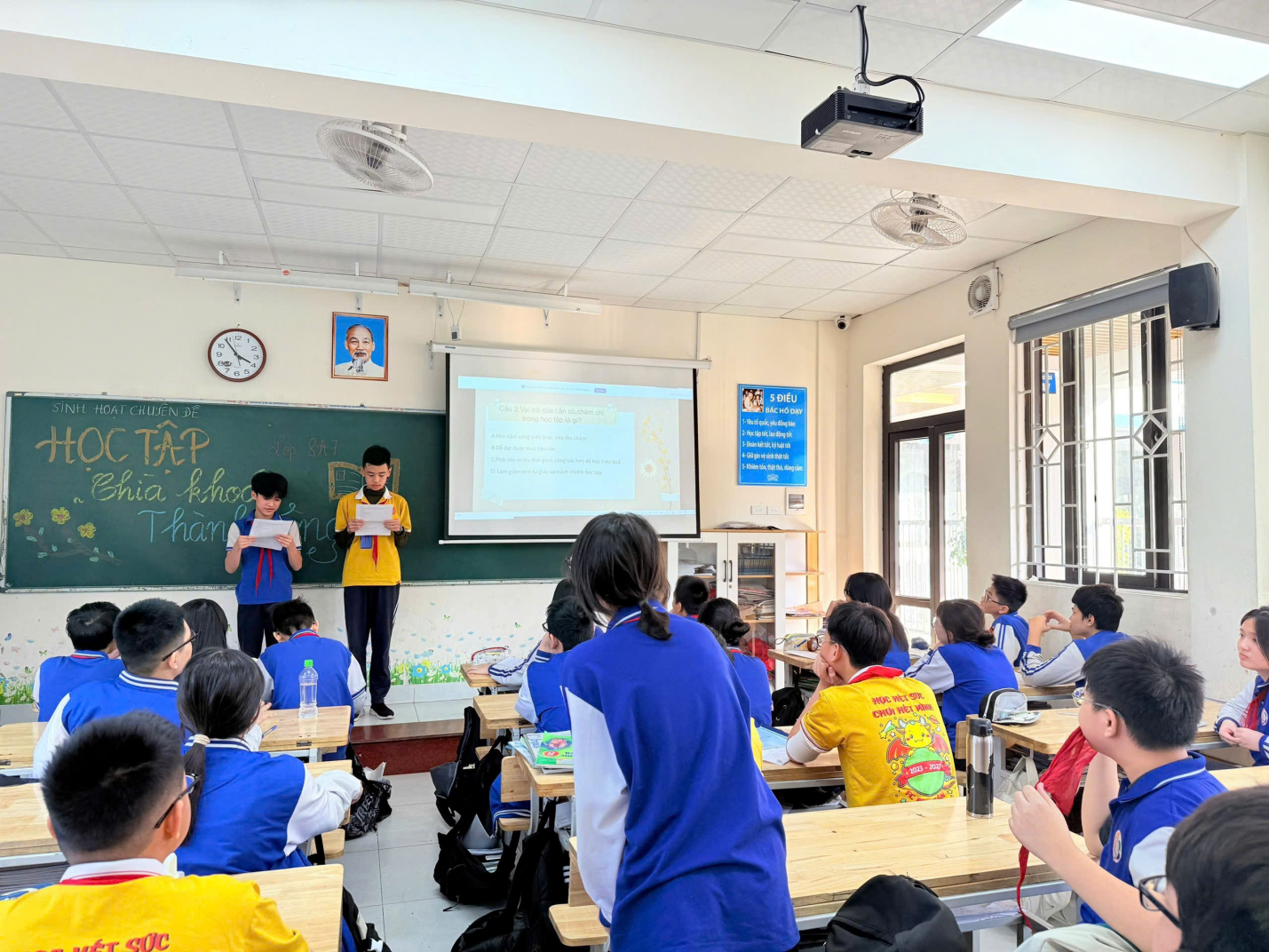 Phần trình bày của nhóm báo cáo viên lớp 8A7 là điểm nhấn của buổi sinh hoạt. Các bạn tự tin đứng trước lớp, chia sẻ về phương pháp học tập hiệu quả, cách quản lý thời gian, động lực vượt qua khó khăn và những thói quen nhỏ giúp cải thiện kết quả học tập mỗi ngày. Bài thuyết trình đi kèm trình chiếu sống động càng khiến nội dung trở nên dễ hiểu, cuốn hút hơn.