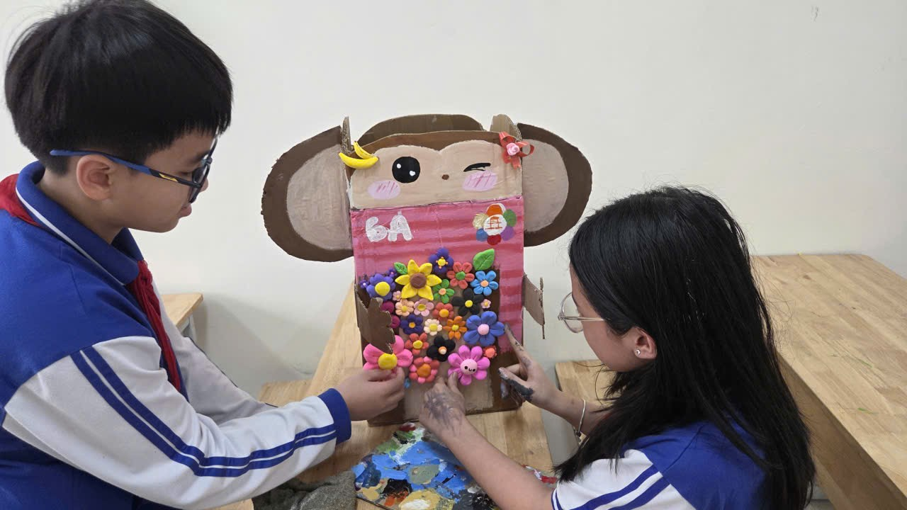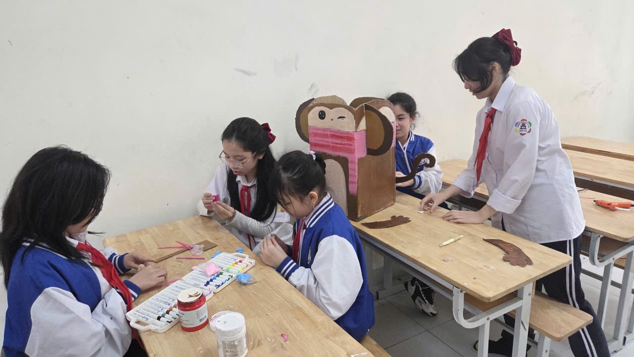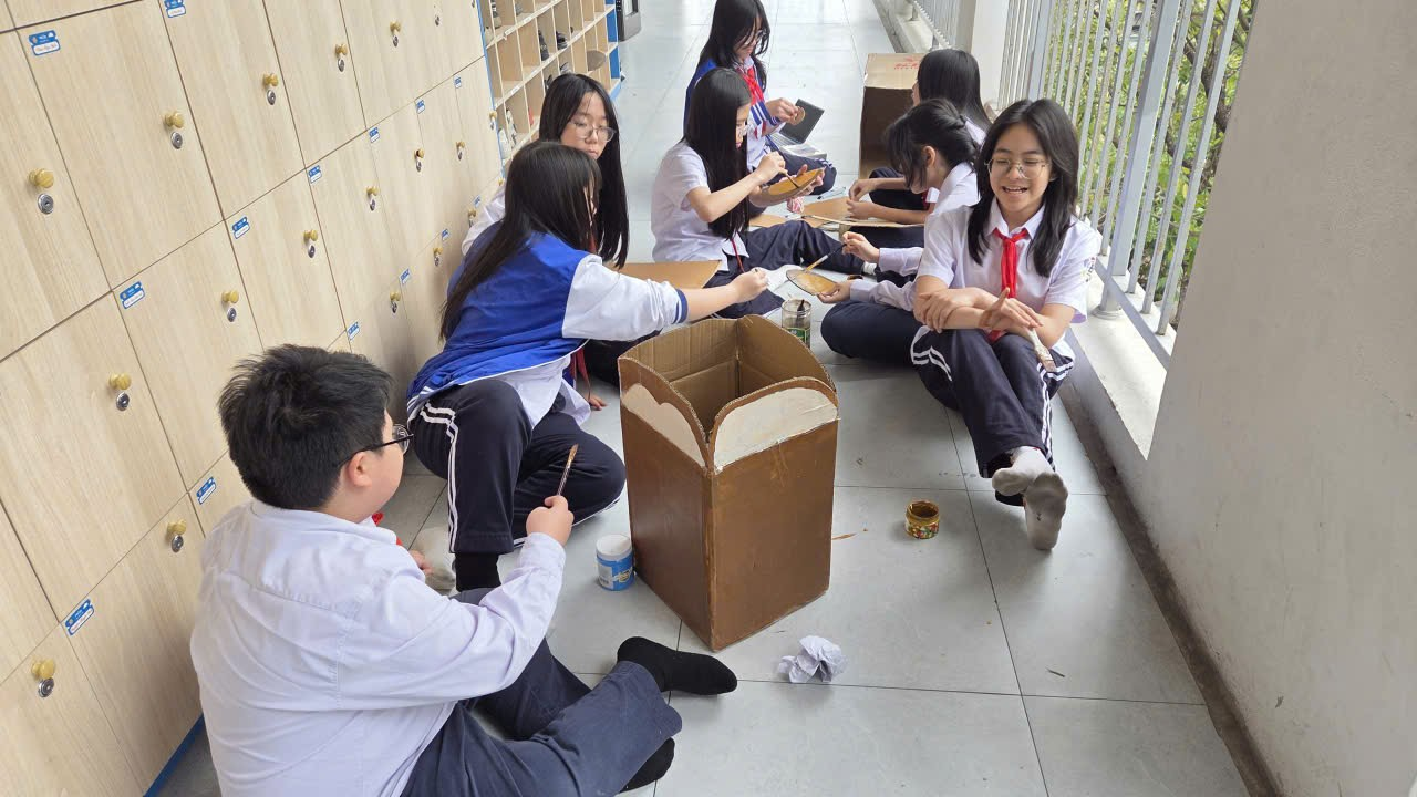 Ban đầu chỉ là những chiếc hộp giấy đơn giản, có phần “mộc mạc”, nhưng dưới bàn tay khéo léo và trí tưởng tượng phong phú của các bạn, chúng đã nhanh chóng “lột xác” đầy ngoạn mục. Bạn thì tỉ mỉ đo đạc, cắt dán thật ngay ngắn; bạn khác say sưa vẽ lên đó những cành đào hồng thắm, những bông mai vàng rực rỡ; có bạn còn cẩn thận viết thêm những khẩu hiệu dễ thương như: “Hãy bỏ rác đúng nơi nhé!” hay “Phân loại rác – việc nhỏ, ý nghĩa lớn!”.