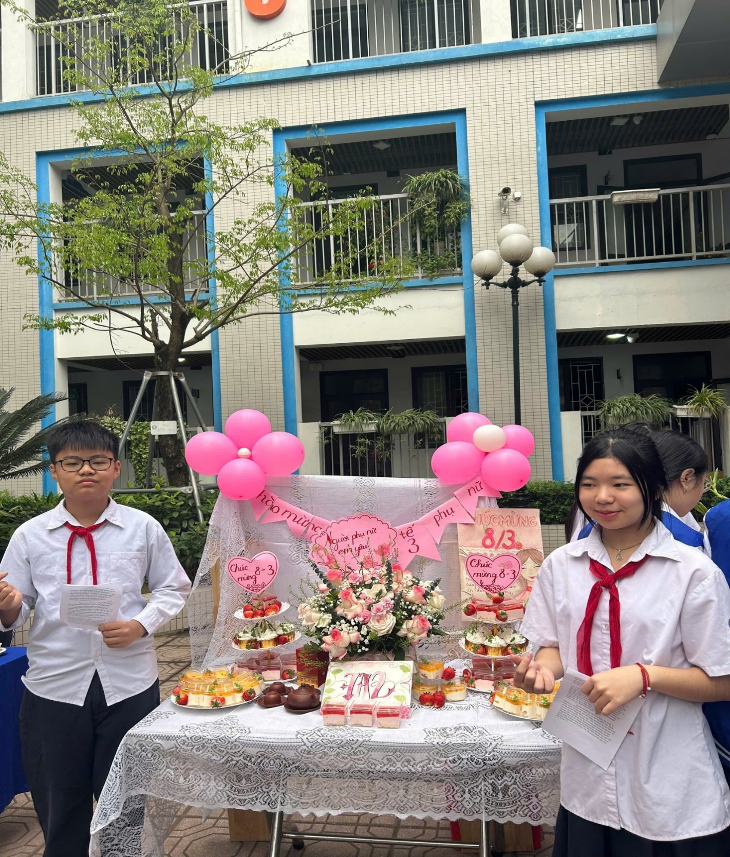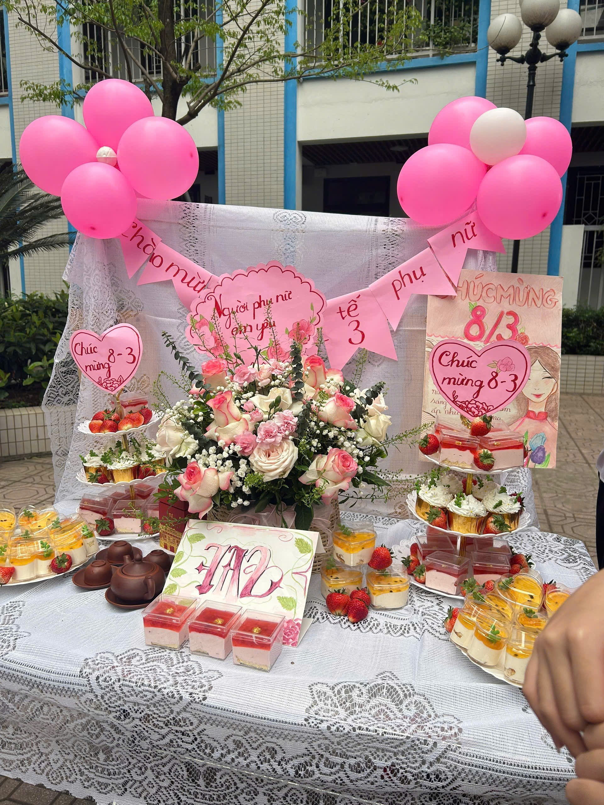 Từng chiếc bánh cupcake nhỏ xinh, những đĩa dâu tây đỏ mọng hay những chiếc bánh mochi tròn trịa đều được các bạn học sinh 7A2 tự tay chuẩn bị và bày biện khéo léo. Mỗi món quà ngọt ngào trên bàn tiệc đều gửi gắm một thông điệp: “Mong những người phụ nữ chúng em yêu luôn được hạnh phúc và ngọt ngào như chính những viên kẹo này.”