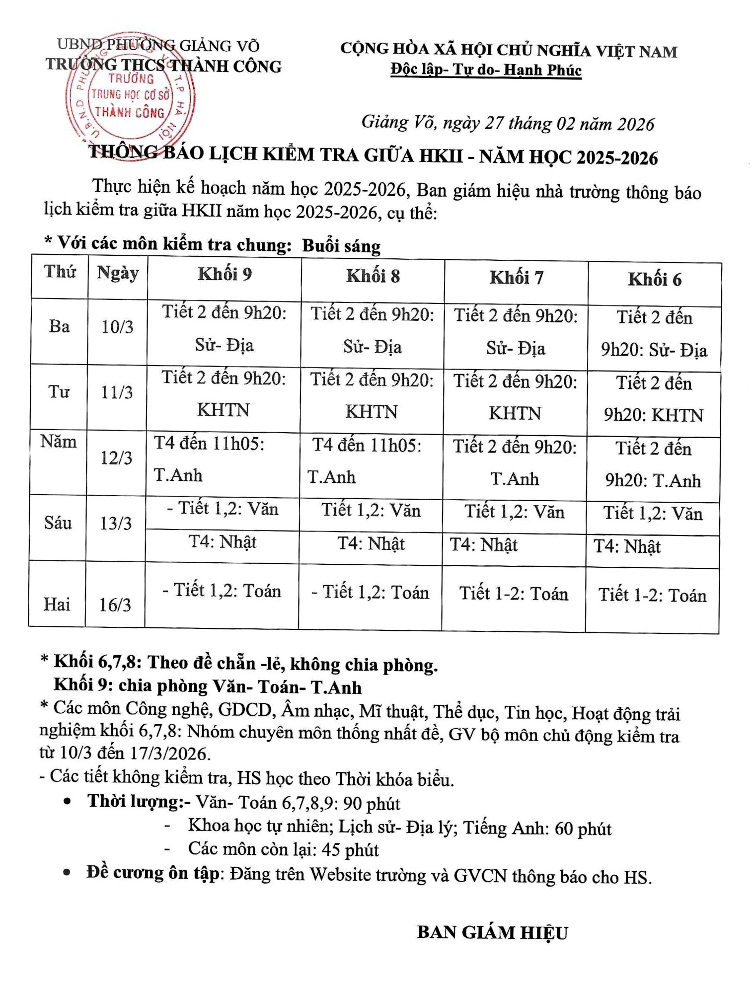 Dưới đây là đề cương ôn tập và lịch kiểm tra giữa kì 2 năm học 2025-2026 của trường THCS Thành Công. Chúc các em học sinh ôn tập tốt và đạt kết quả cao trong kì thi!