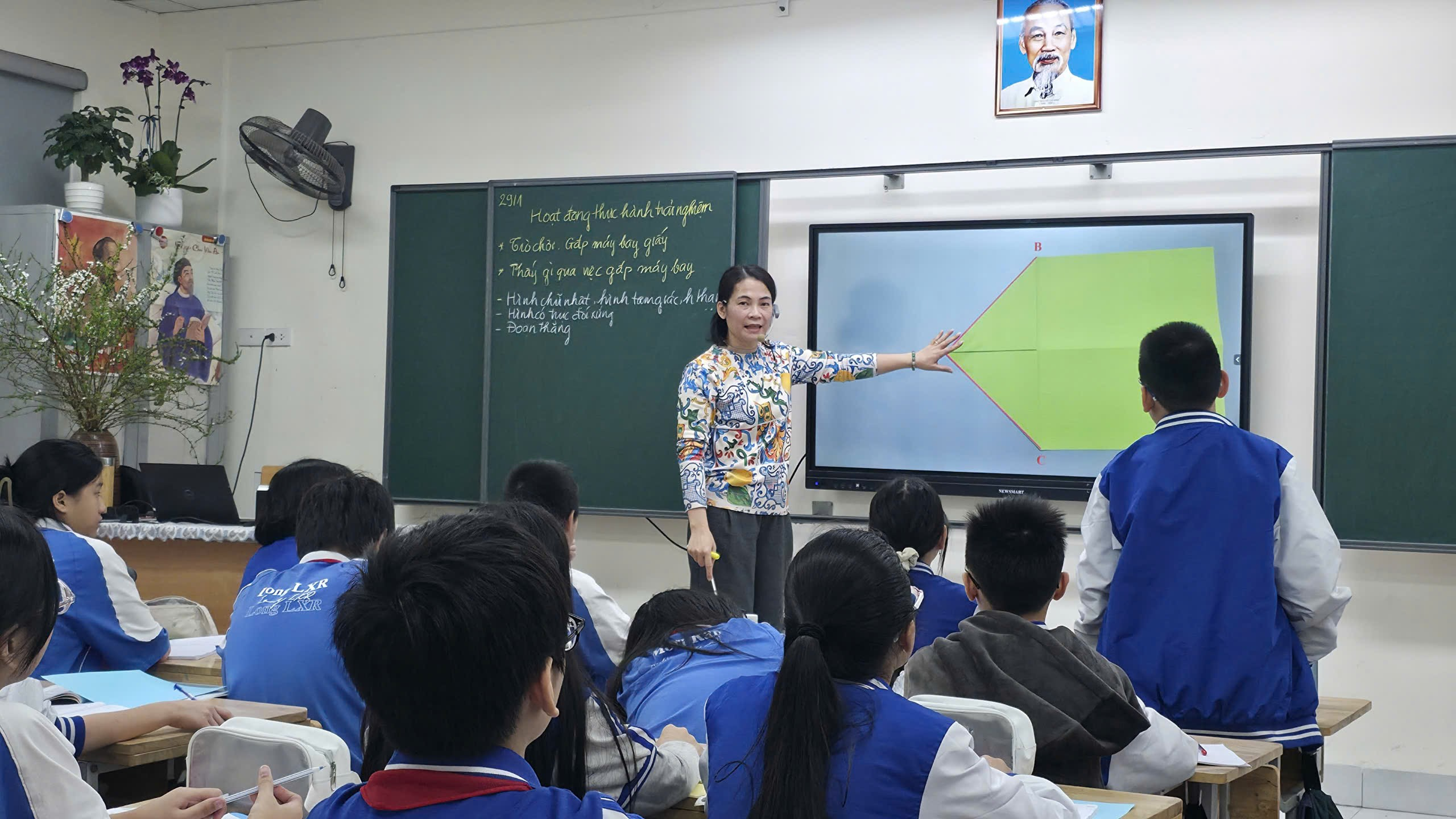 Thay vì những công thức trên bảng đen, cô Lan đã dẫn dắt chúng em ôn lại các kiến thức hình học phẳng đã học một cách vô cùng độc đáo: Gấp máy bay giấy.