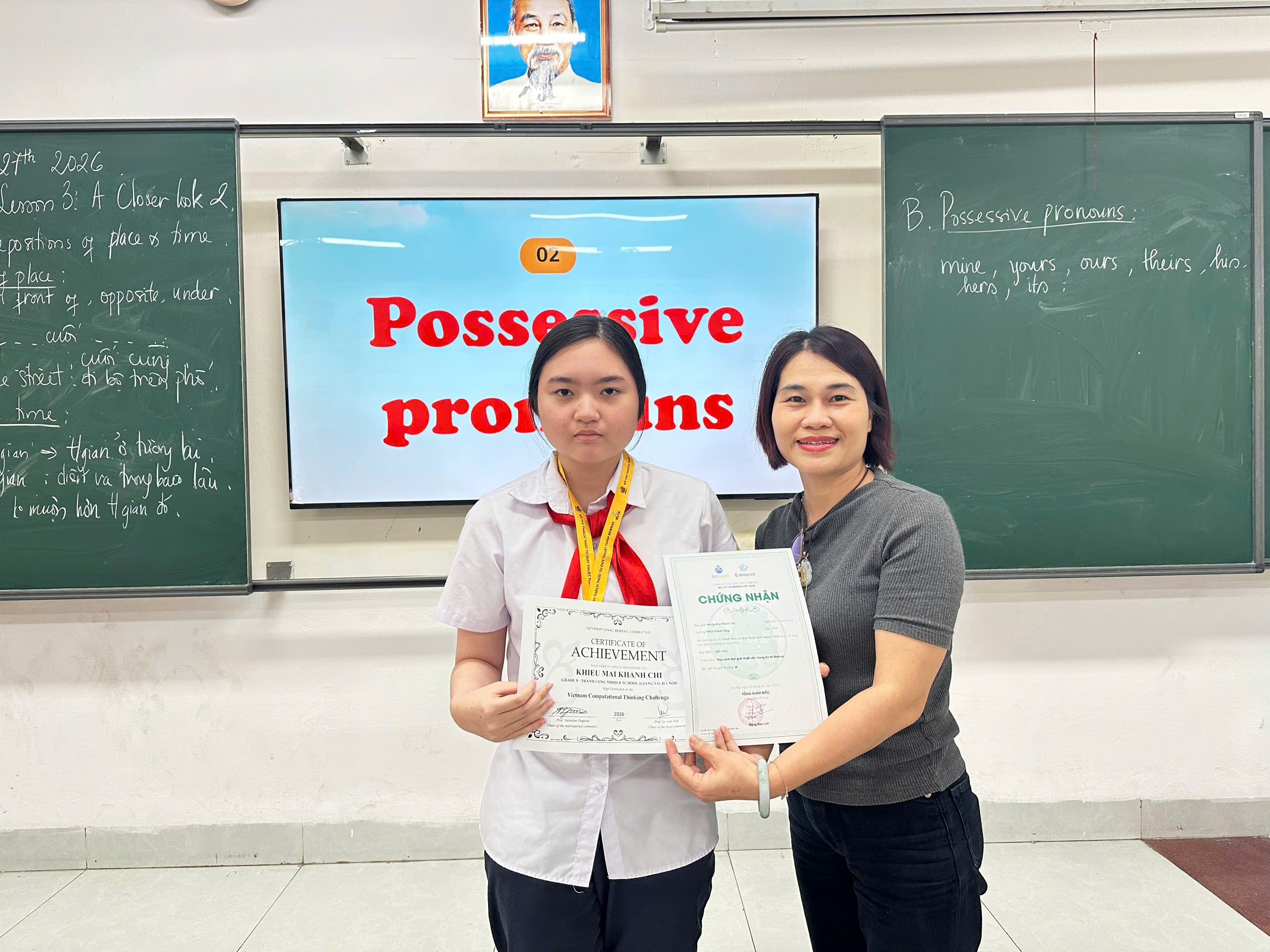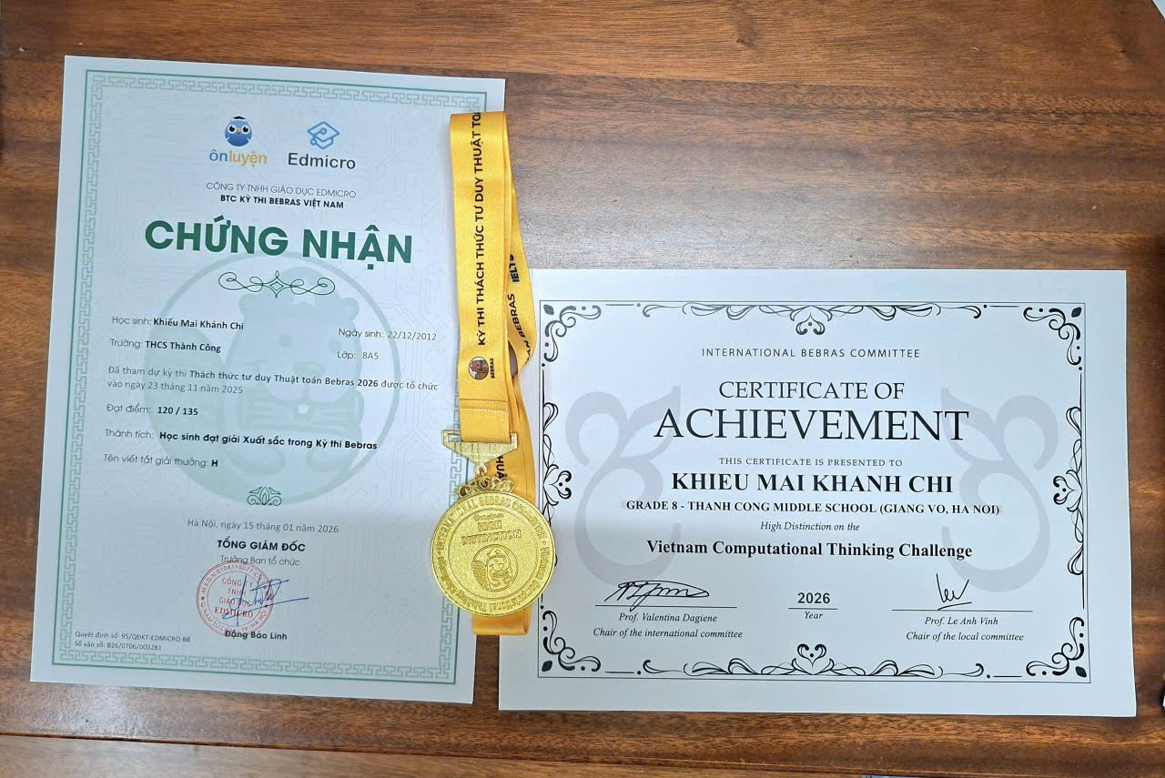 Giải Xuất sắc tại Bebras Việt Nam là thành quả của những đêm miệt mài bên trang sách, là sự kiên trì không bỏ cuộc trước những thử thách "hack não". Nhưng điều khiến 8A5 tự hào nhất về Chi không chỉ là điểm số, mà là tinh thần học hỏi không ngừng và cách Chi luôn sẵn lòng sẻ chia kiến thức với bạn bè xung quanh.Tấm bằng khen lần này không chỉ là niềm tự hào cá nhân, mà còn là đóa hoa rực rỡ Chi dành tặng cho thầy cô và mái trường Thành Công thân yêu. Nó khẳng định rằng: Với đam mê và tư duy đúng đắn, không có "thuật toán" nào là không thể giải mã!