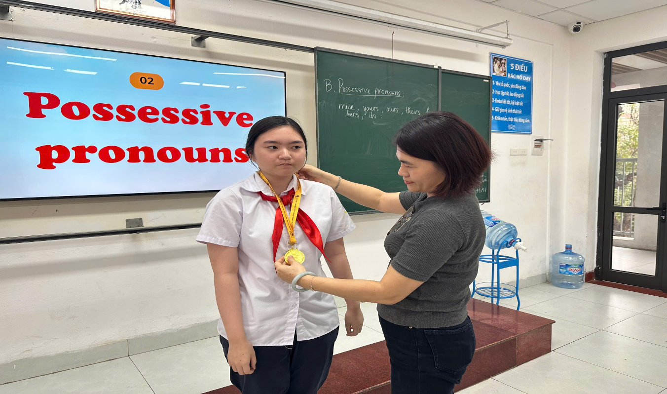 Cô Hoài Anh đeo huy chương một cách tự hào cho học trò của mình
