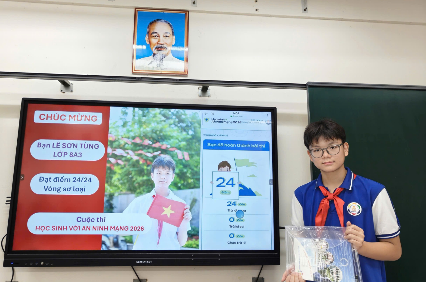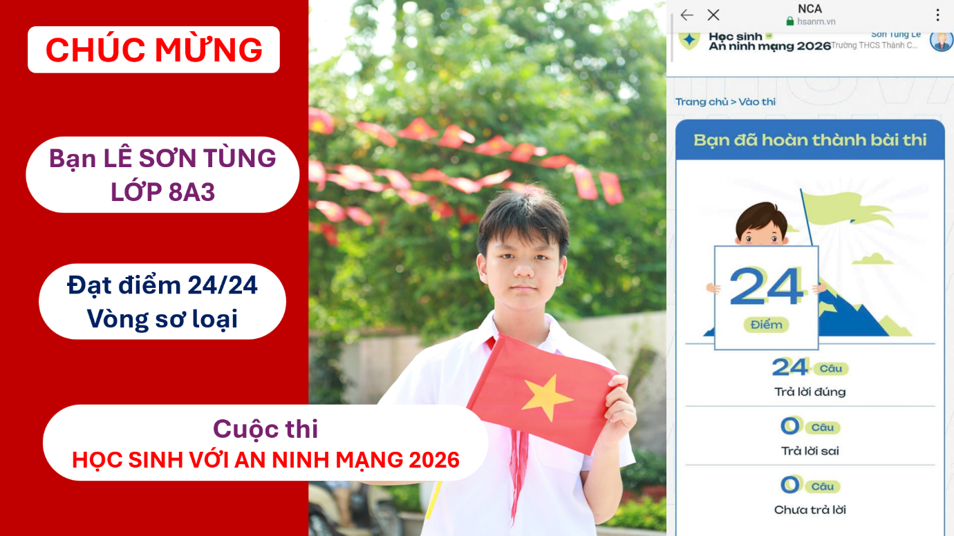 Tin vui đáng tự hào từ lớp 8A3, trường THCS Thành Công! Bạn Lê Sơn Tùng đã xuất sắc đạt 24/24 điểm tuyệt đối tại vòng sơ khảo và chính thức góp mặt trong Top 10 thí sinh tiêu biểu đại diện Thành phố Hà Nội tham dự vòng chung khảo cuộc thi “Học sinh với an ninh mạng năm 2026”.