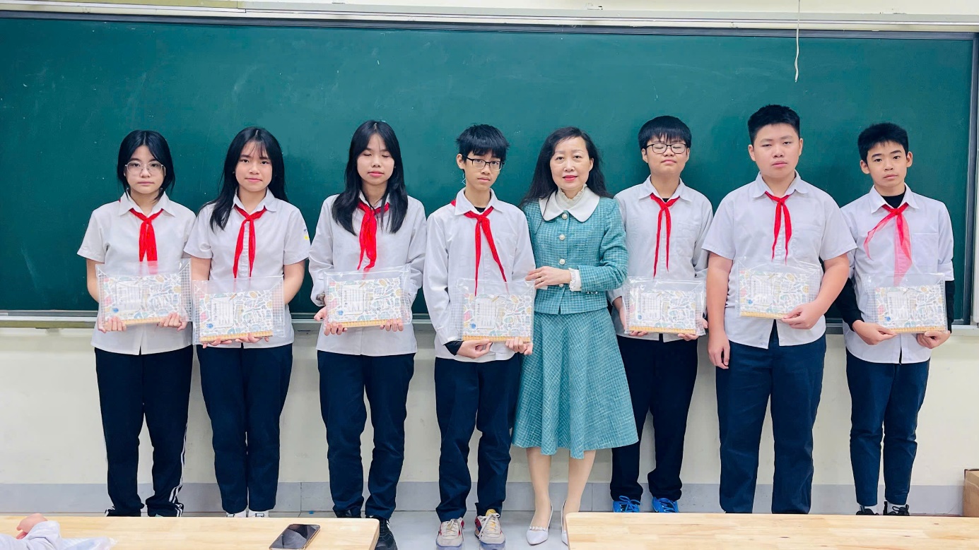 Cô giáo chủ nhiệm Đỗ Thị Minh Nhuệ tặng quà cho những bạn học sinh có thành tích tiêu biểu
