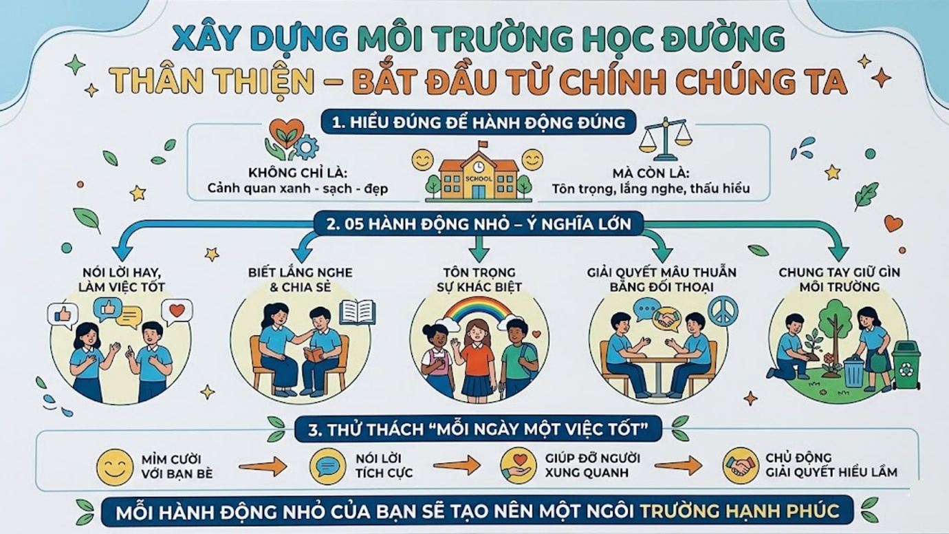 Môi trường học đường thân thiện không chỉ là những lớp học sạch đẹp hay sân trường rợp bóng cây xanh, mà còn là nơi mọi người biết tôn trọng, lắng nghe và thấu hiểu nhau. Đó là khi không còn những lời nói vô tình gây tổn thương, không có sự xa lánh hay hiểu lầm giữa bạn bè.