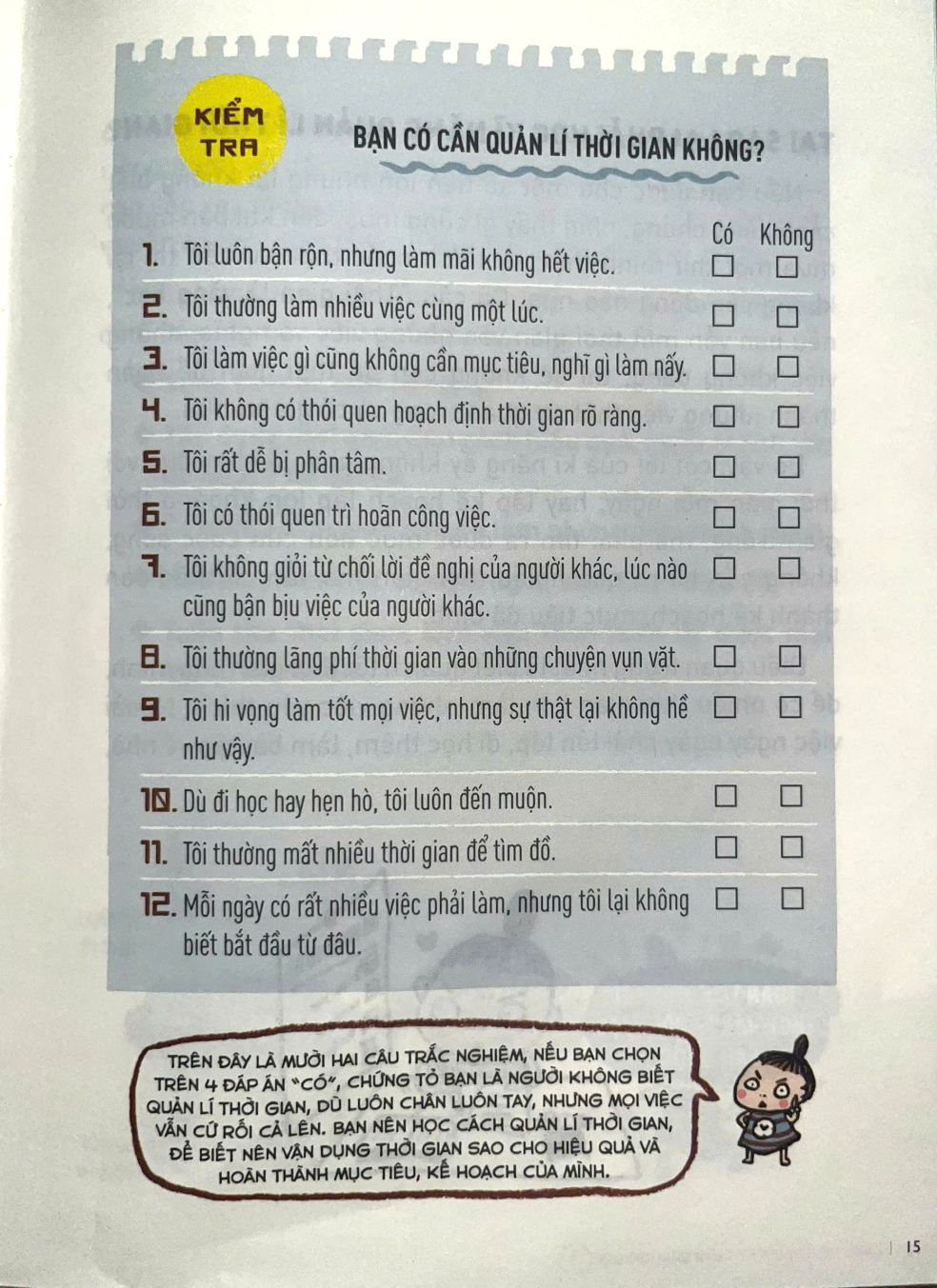 Bên cạnh đó, cuốn sách cũng chỉ ra thực trạng phổ biến của nhiều bạn trẻ hiện nay. Không ít người thường xuyên rơi vào tình trạng làm việc không có kế hoạch, dễ bị phân tâm, trì hoãn công việc và lãng phí thời gian vào những việc không cần thiết. Chính những thói quen xấu này đã khiến hiệu quả học tập và làm việc giảm sút đáng kể. Thông qua những câu hỏi tự đánh giá, cuốn sách giúp mỗi người nhận ra bản thân mình có thực sự biết quản lí thời gian hay chưa.