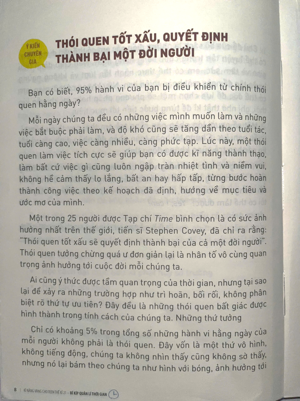 Trước hết, cuốn sách giúp chúng ta hiểu rõ quản lí thời gian là gì. Quản lí thời gian không chỉ đơn thuần là sắp xếp công việc trong ngày, mà còn là cách phân bổ thời gian một cách hợp lí để đạt được mục tiêu đã đề ra. Khi biết cách quản lí thời gian, chúng ta có thể lập kế hoạch học tập và làm việc hiệu quả hơn, tránh tình trạng vội vàng, căng thẳng hay phải thức khuya trước mỗi kì thi. Đây chính là chìa khóa giúp chúng ta chủ động trong mọi việc.