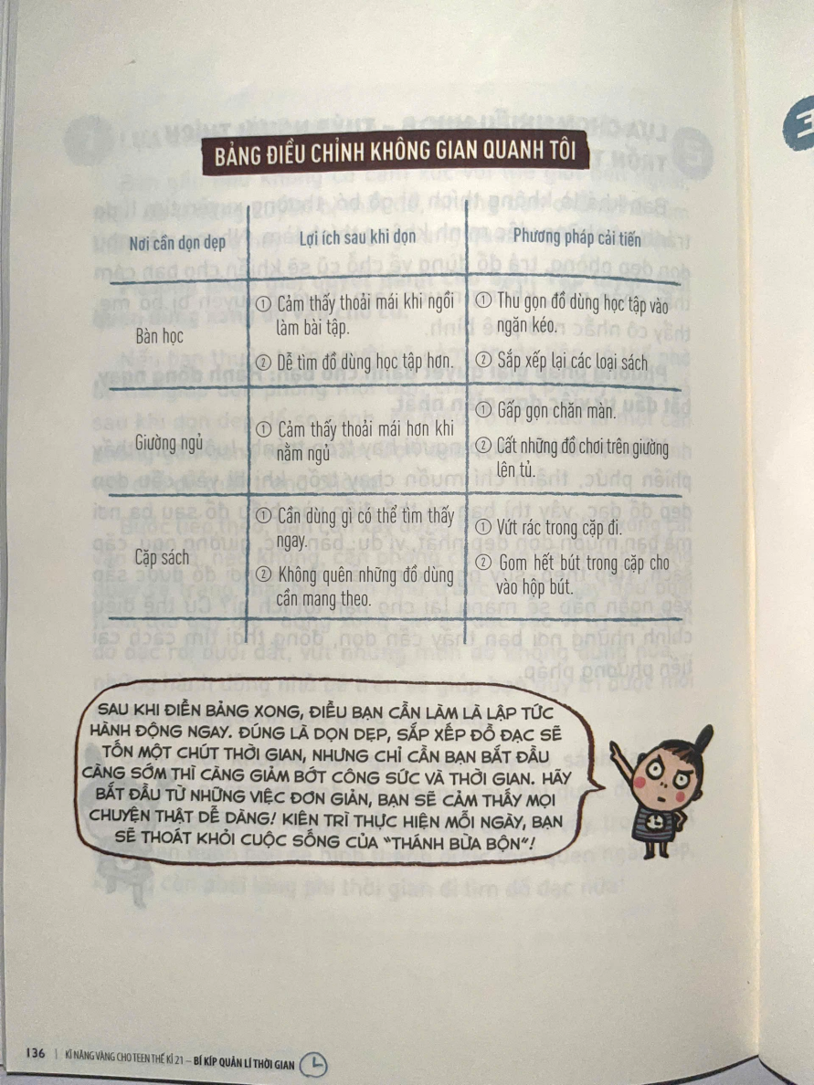 Không chỉ dừng lại ở lí thuyết, cuốn sách còn đưa ra nhiều phương pháp cụ thể và dễ áp dụng. Chẳng hạn như việc thiết lập ưu tiên cho công việc, tránh trì hoãn, lập kế hoạch rõ ràng hay giữ cho không gian học tập gọn gàng, ngăn nắp. Những việc tưởng chừng nhỏ bé này lại có tác động rất lớn, giúp tiết kiệm thời gian, nâng cao hiệu suất và tạo cảm hứng trong học tập cũng như làm việc.