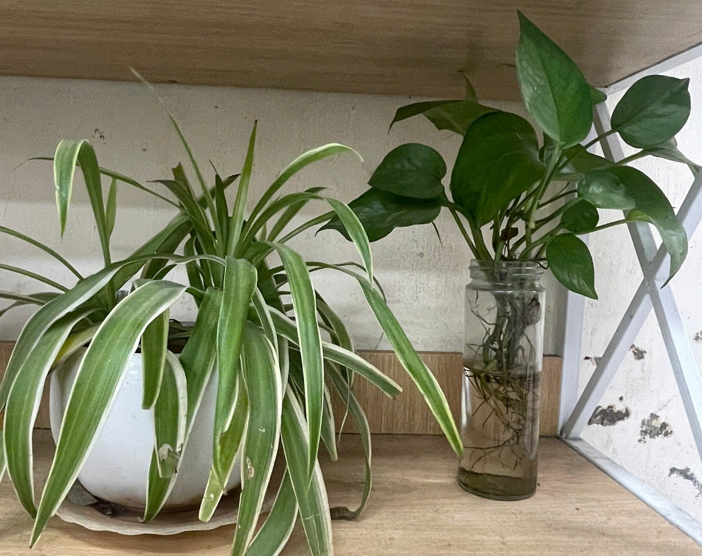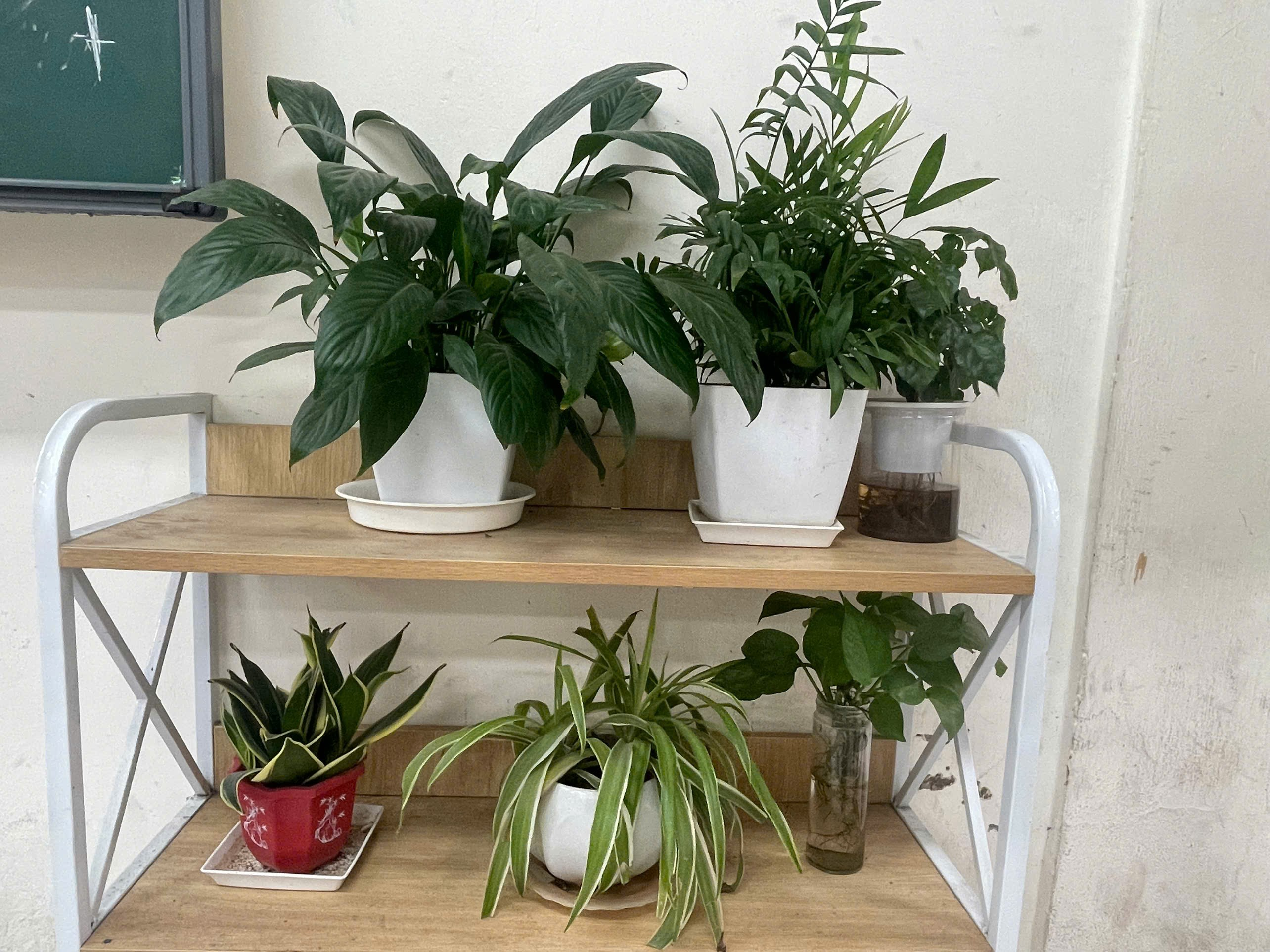 Ngay trong lớp học và trước cửa lớp 7A8, “góc xanh” hiện lên giản dị mà đầy sức sống. Trên chiếc kệ nhỏ, những chậu cây được sắp xếp gọn gàng, ngay ngắn. Lá cây xanh mướt, vươn nhẹ trong ánh sáng, có chậu đặt trong đất, có chậu được chăm sóc trong nước, tất cả tạo nên một khoảng xanh hài hòa, mát mắt.