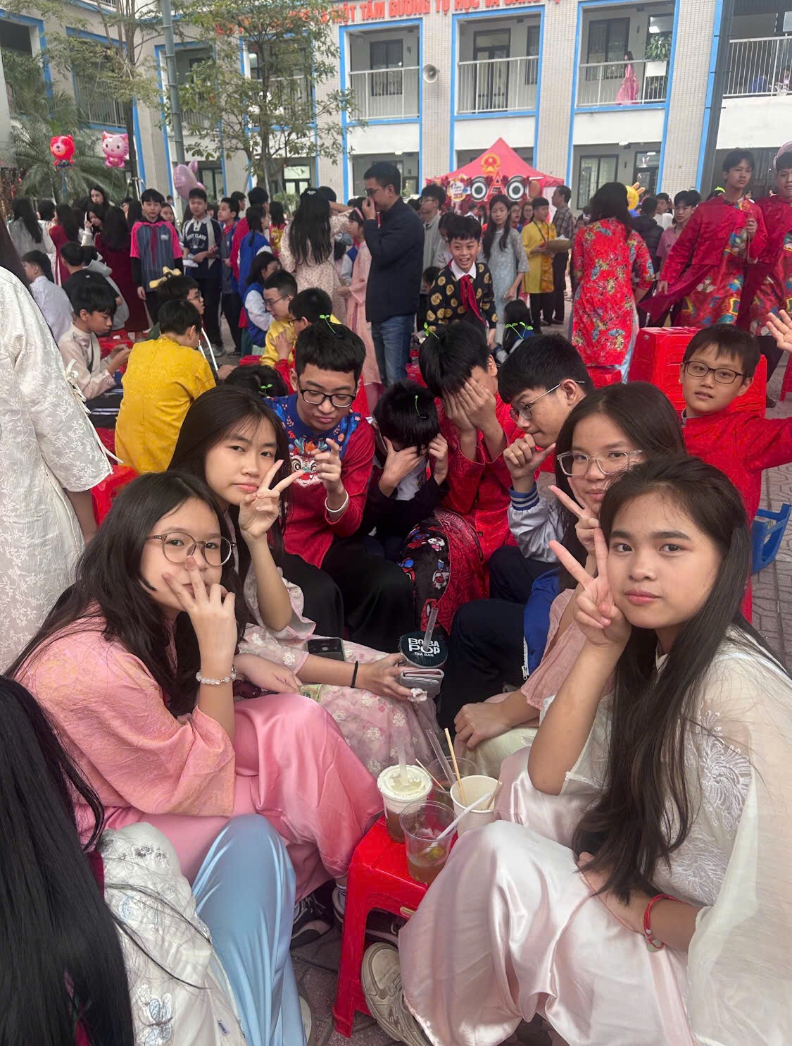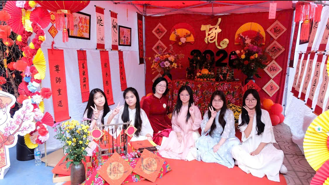 Chúng mình chụp ảnh kỉ niêm với cô giáo chủ nhiệm, không khí Tết đoàn viên ùa về.