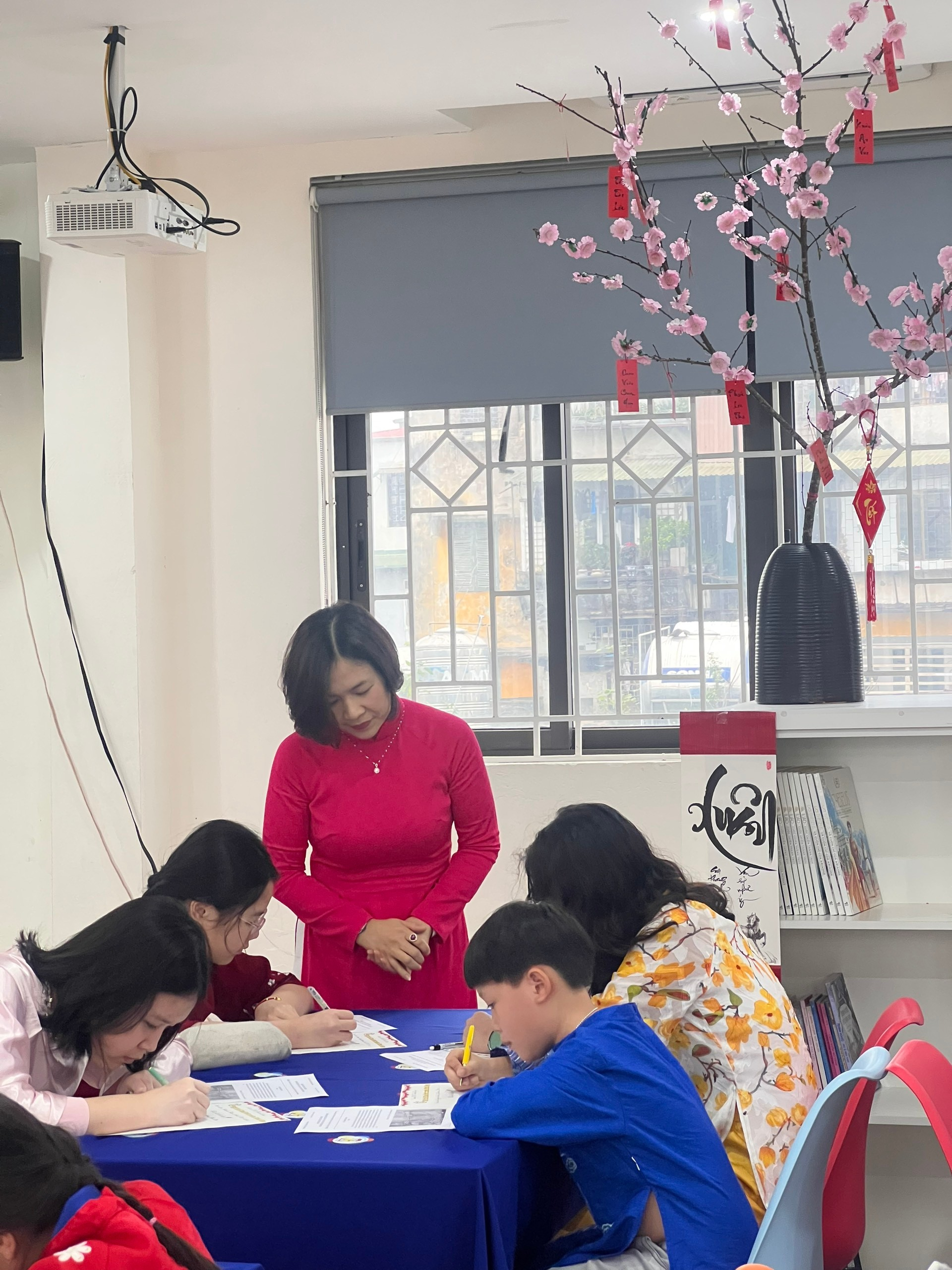 Bạn Kim Anh (áo dài hồng) nắn nót từng nét chữ