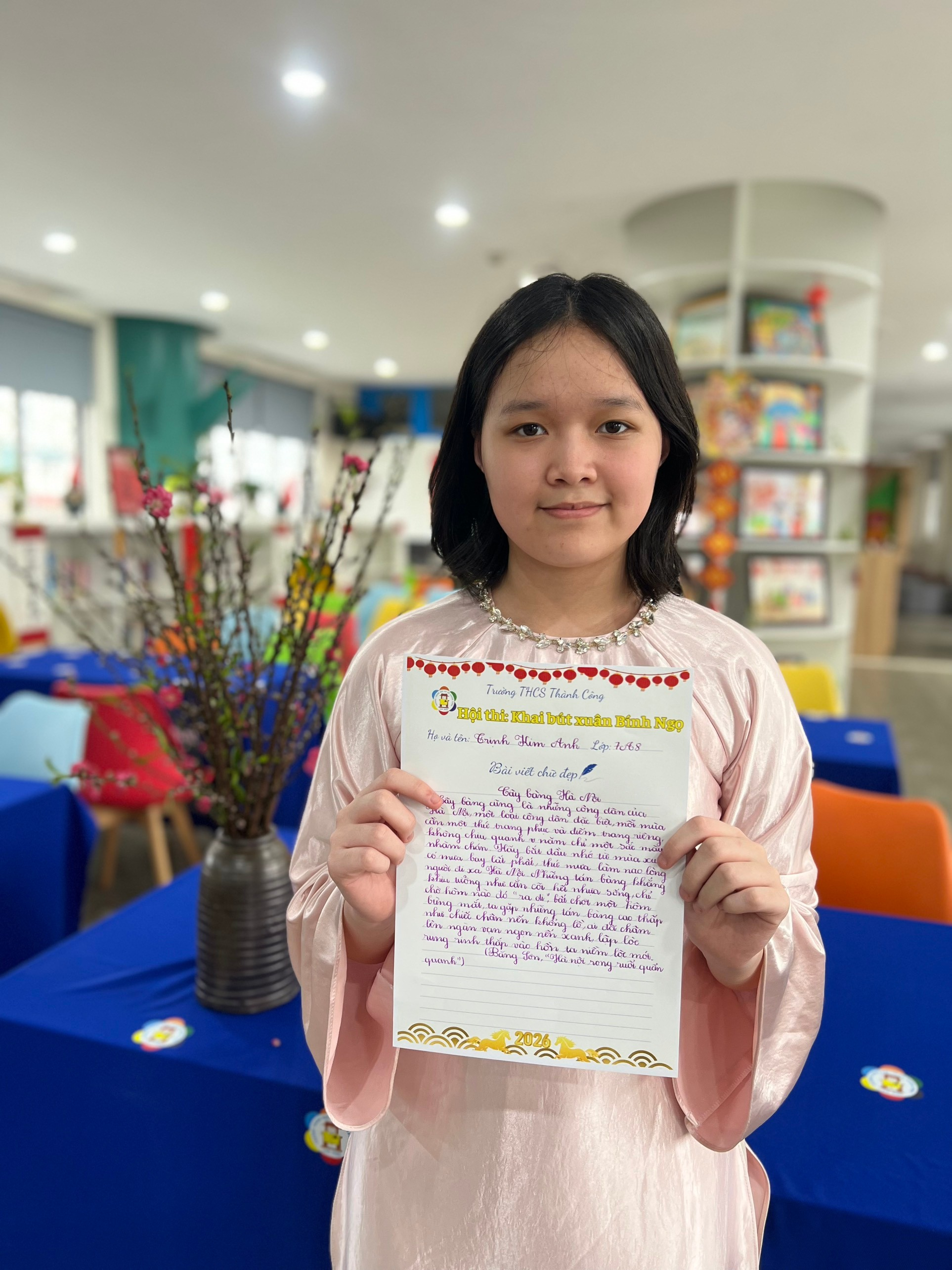 Trong không khí rộn ràng của những ngày đầu năm mới 2026, sân trường Trường THCS Thành Công như rộn ràng hơn với hội thi “Khai bút đầu xuân” – một hoạt động giàu ý nghĩa nhằm gìn giữ và lan tỏa nét đẹp văn hóa truyền thống. Giữa những gương mặt học sinh say mê bên trang giấy trắng, bạn Trịnh Kim Anh, học sinh lớp 7A8, đã để lại nhiều ấn tượng đẹp bằng sự tự tin và trân trọng từng nét chữ.