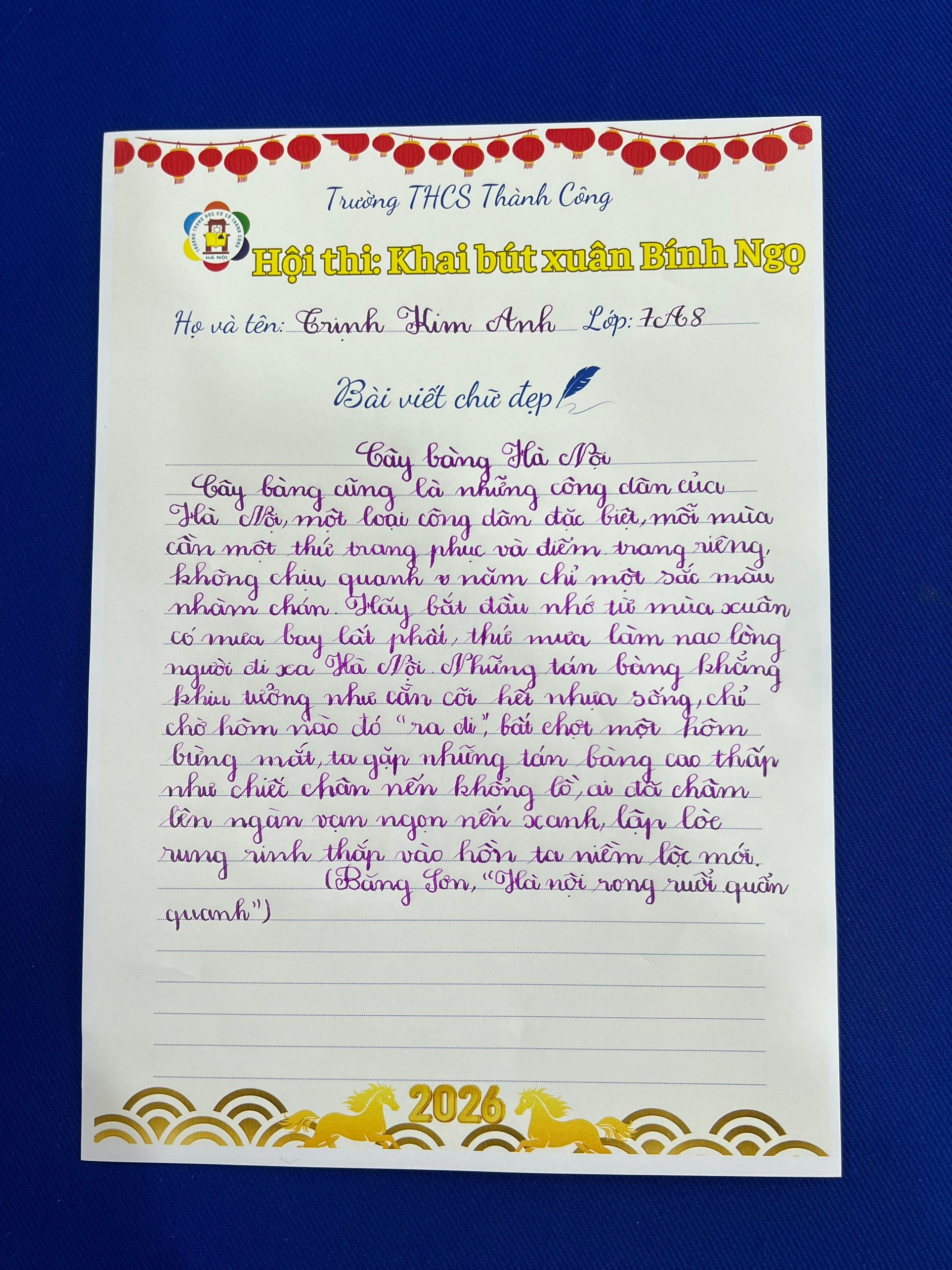 Hội thi Khai bút đầu năm 2026 khép lại trong niềm vui và sự phấn khởi. Những trang giấy trắng đã được lấp đầy bằng ước mơ và khát vọng. Và trong đó, hình ảnh cô học trò lớp 7A8 lặng lẽ nhưng đầy quyết tâm bên bàn viết đầu xuân chính là một nét đẹp giản dị, góp phần làm nên sắc xuân rạng rỡ của mái trường THCS Thành Công.