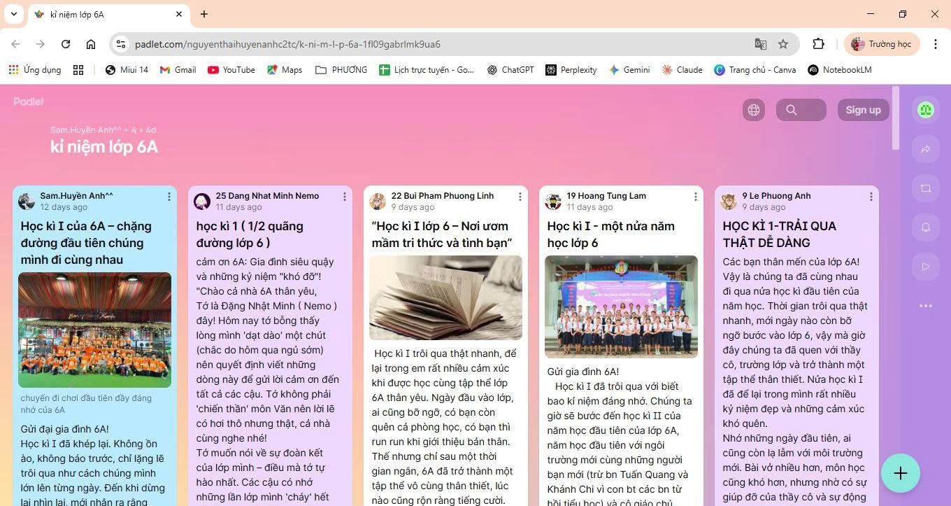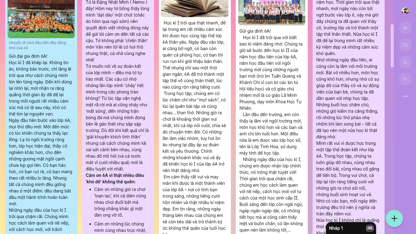 Mỗi hình ảnh, mỗi dòng cảm xúc được chia sẻ đều mang theo những kỉ niệm đáng nhớ của tuổi học trò. Không chỉ là nơi lưu giữ hình ảnh, Padlet này còn là nơi ghi lại tình bạn, sự đoàn kết và những bước trưởng thành đầu tiên của tập thể lớp 6A. Sau này khi nhìn lại, chắc chắn chúng mình sẽ nhớ về một học kì I thật ý nghĩa, đầy ắp kỉ niệm và cảm xúc!