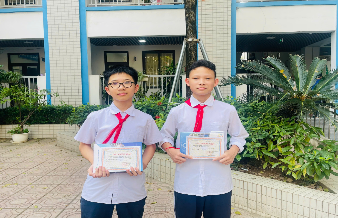 Bạn Bảo An với giải Nhất và bạn Gia Minh với giải Ba môn Tiếng Anh
