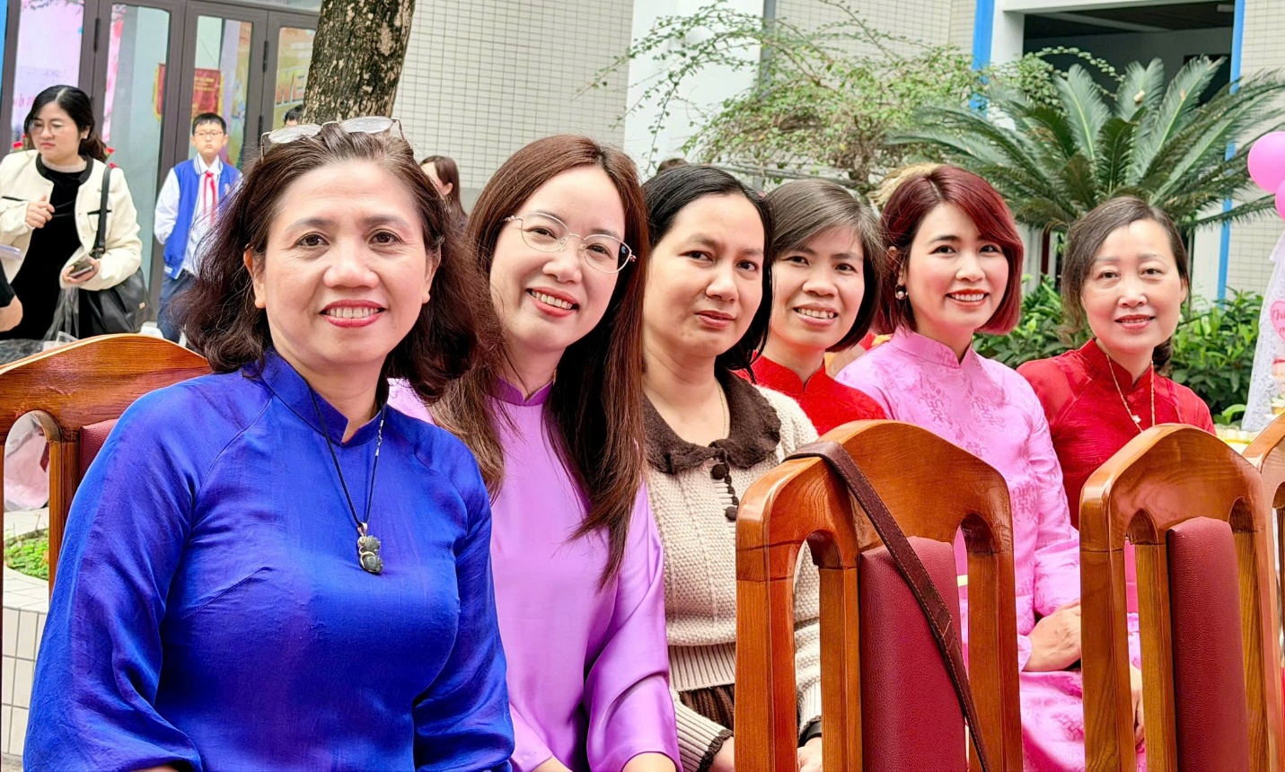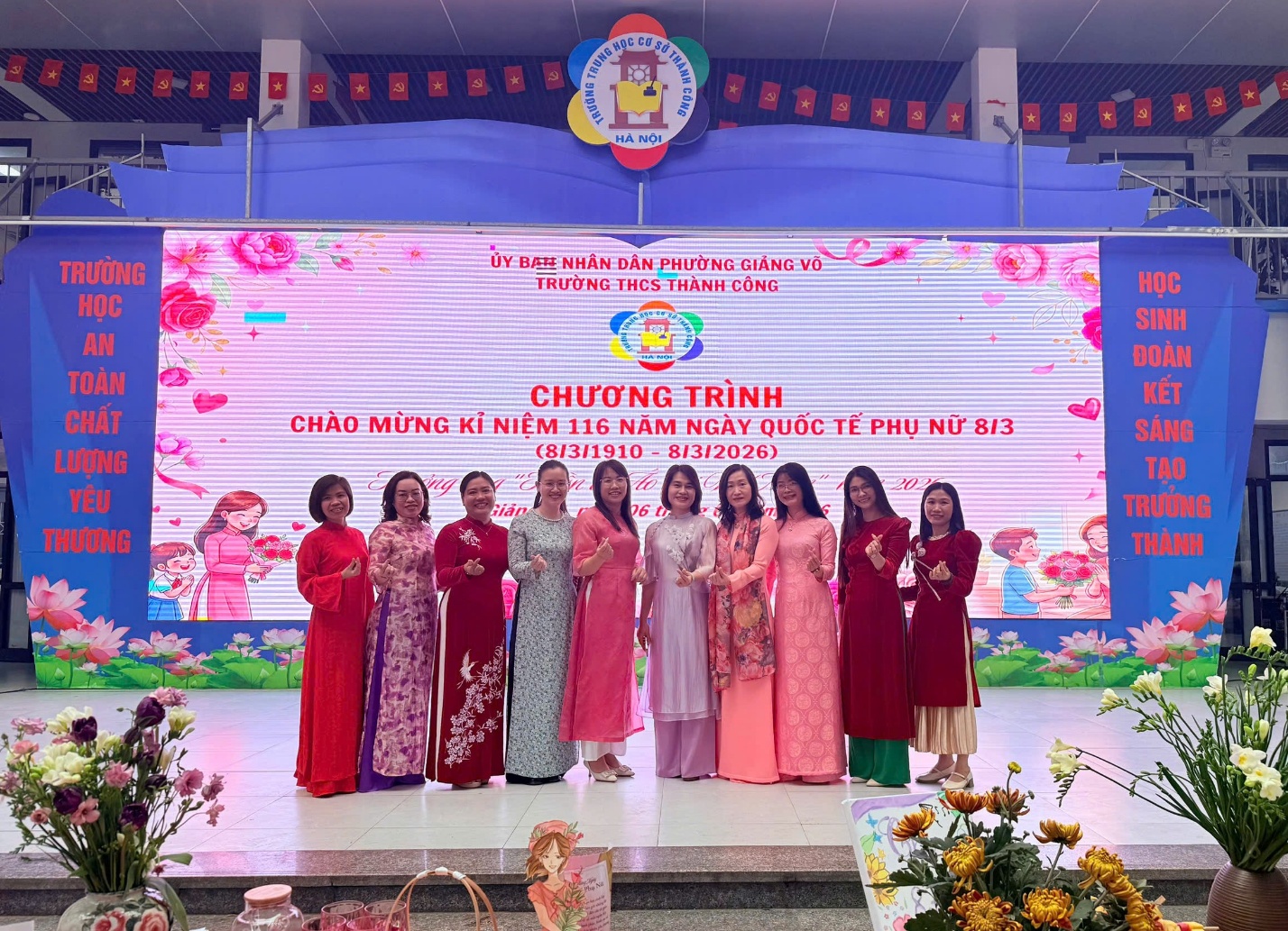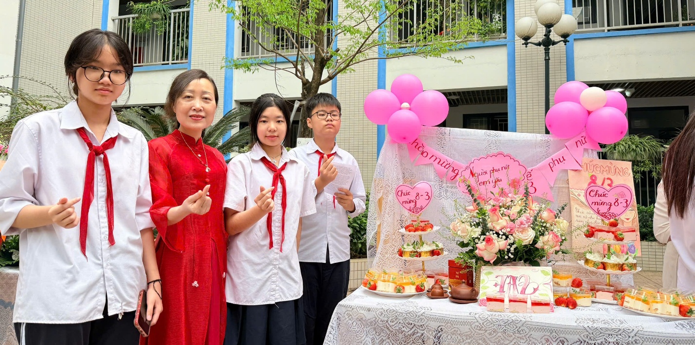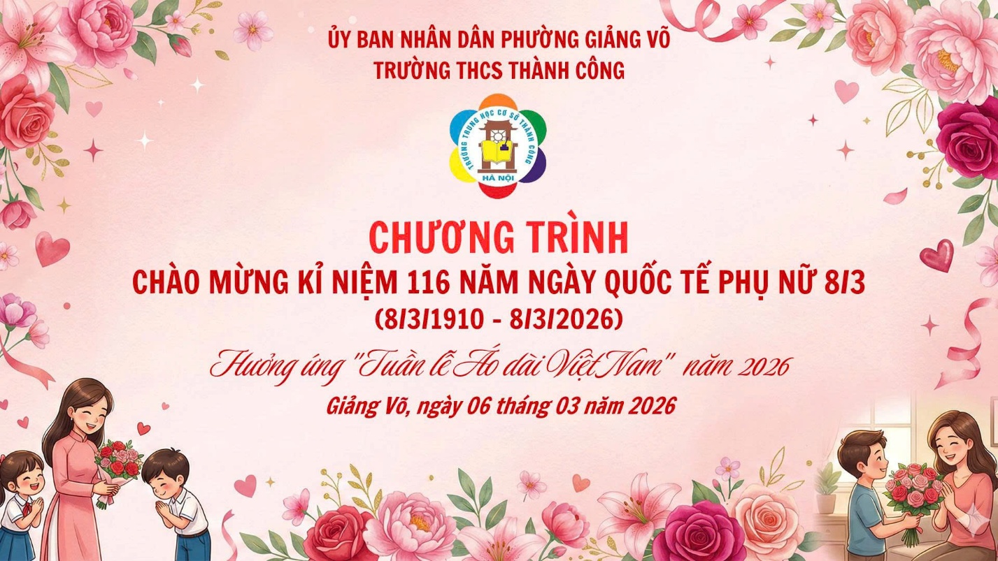 Tháng 3 về, nắng xuân dịu dàng trải khắp sân trường, Trường THCS Thành Công như khoác lên mình một sắc màu tươi mới. Sân khấu được trang trí rực rỡ, các lớp học tươi tắn với những dải băng, sắc hoa và biểu ngữ chào mừng Ngày Quốc tế Phụ nữ 8/3. Trong không gian ấy, hình ảnh các cô giáo duyên dáng trong tà áo dài mềm mại, các bà mẹ học sinh thân thiện và những nữ sinh rạng rỡ trong đồng phục chỉnh tề đã tạo nên một bức tranh thật ấm áp, đầy cảm xúc của ngày hội tôn vinh phụ nữ.
