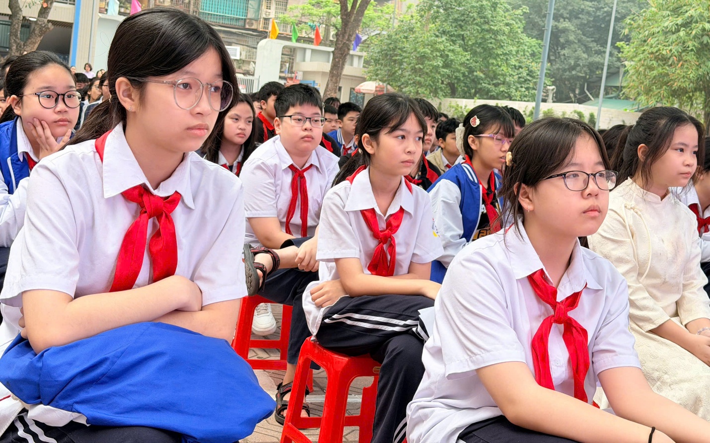 Chương trình sinh hoạt dưới cờ kỷ niệm 116 năm Ngày Quốc tế Phụ nữ 8/3 (1910 – 2026) diễn ra trong không khí trang trọng nhưng cũng rất gần gũi. Những tiết mục văn nghệ mở màn đã nhanh chóng khuấy động sân trường. Ca khúc “Mẹ ơi đừng lo” do lớp 7A4 thể hiện và “Mẹ hãy nắm chặt tay con” của lớp 6A3 mang đến những giai điệu ngọt ngào, chan chứa tình cảm. Qua từng lời ca, điệu múa, học sinh gửi gắm lòng yêu thương và biết ơn sâu sắc tới mẹ – người phụ nữ luôn âm thầm dõi theo và nâng đỡ các con trên hành trình trưởng thành.