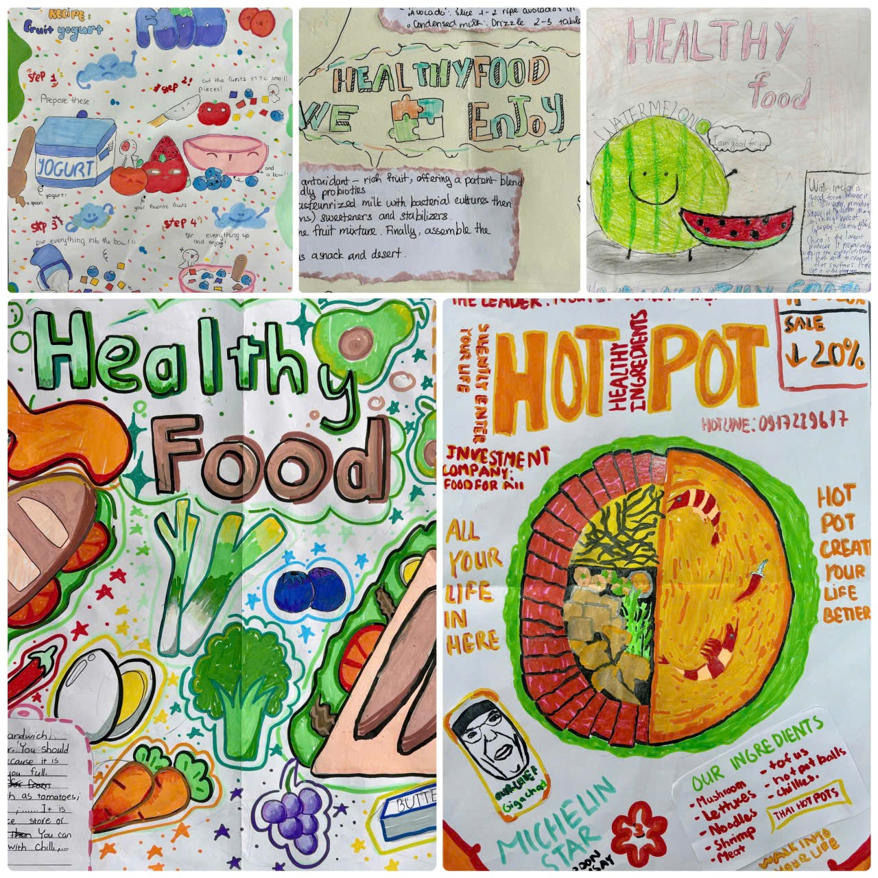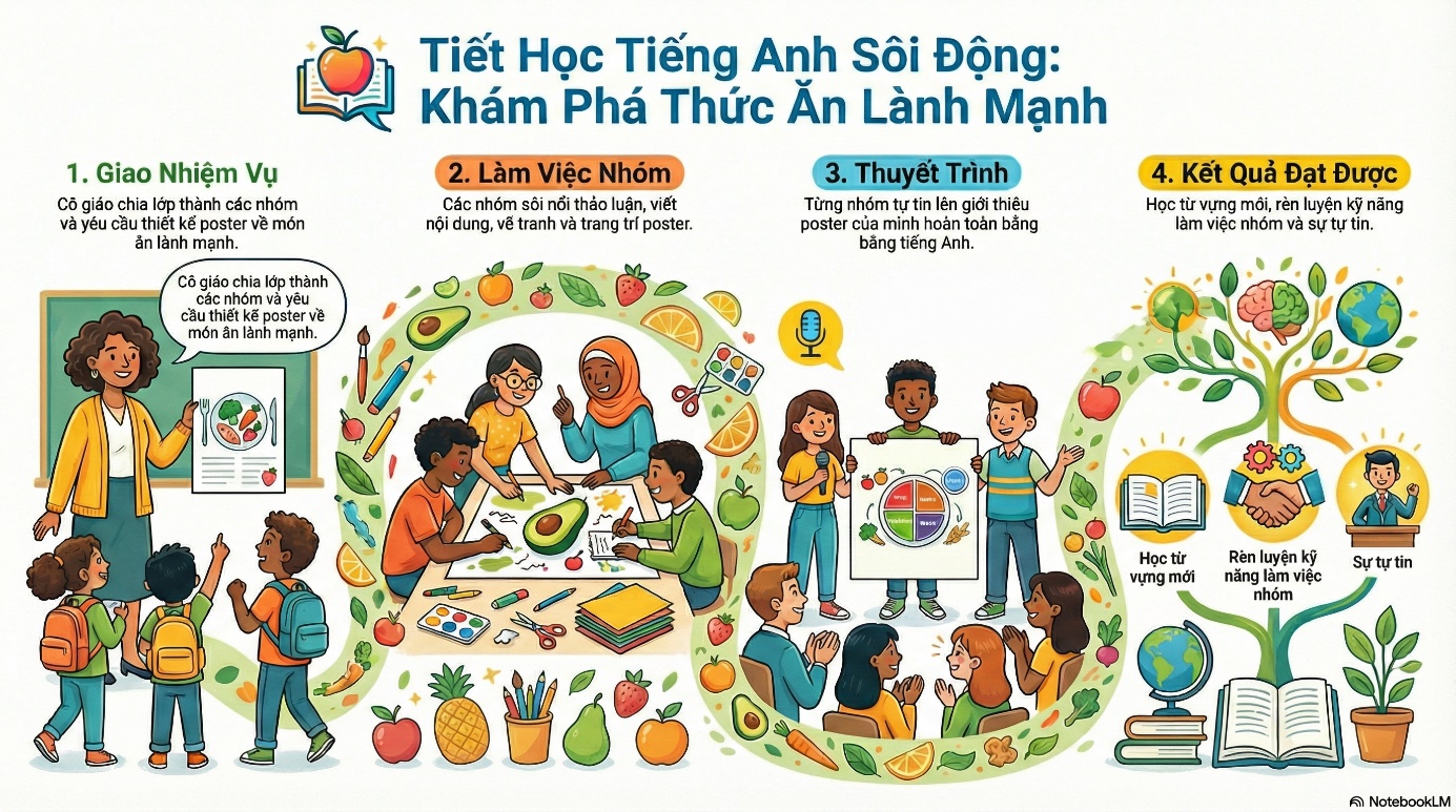 Cô giáo dạy tiếng Anh đã mang đến cho lớp một không khí học tập rất mới mẻ và sáng tạo. Cô chia cả lớp thành các nhóm, mỗi nhóm gồm bốn thành viên và giao nhiệm vụ thiết kế một poster giới thiệu cách làm một số món ăn lành mạnh.