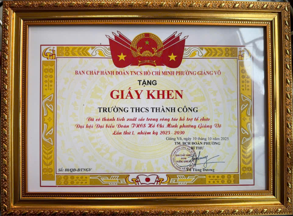 Tại Hội nghị, Trường THCS Thành Công vinh dự được Ban Chấp hành Đoàn TNCS Hồ Chí Minh phường Giảng Võ trao tặng Giấy khen vì đã có thành tích xuất sắc trong công tác hỗ trợ tổ chức Đại hội Đại biểu Đoàn TNCS Hồ Chí Minh phường Giảng Võ lần thứ I, nhiệm kỳ 2025 – 2030.