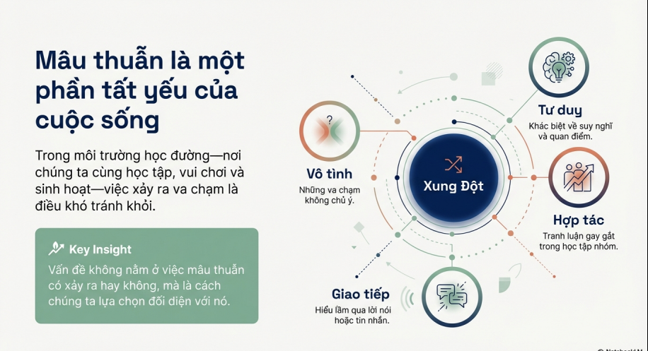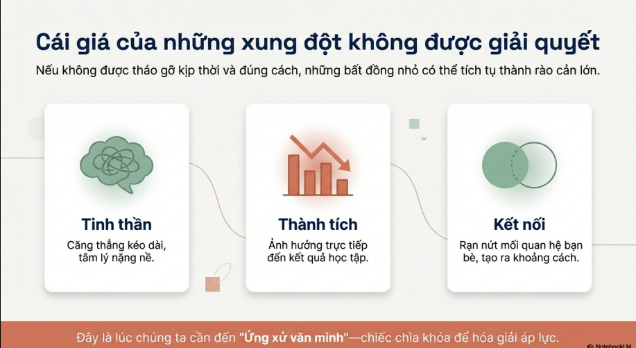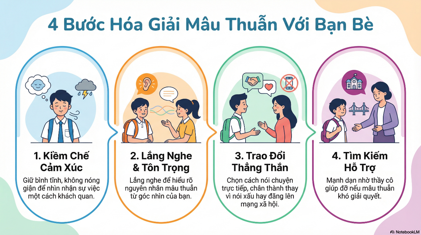 Mâu thuẫn giữa bạn bè thường bắt nguồn từ những nguyên nhân rất quen thuộc: khác biệt về suy nghĩ, tranh luận trong học tập nhóm, hiểu lầm qua lời nói hoặc mạng xã hội, thậm chí chỉ từ những hành động vô tình. Nếu không được giải quyết kịp thời và đúng cách, những mâu thuẫn nhỏ có thể trở thành căng thẳng kéo dài, ảnh hưởng đến tinh thần, kết quả học tập và mối quan hệ bạn bè.
